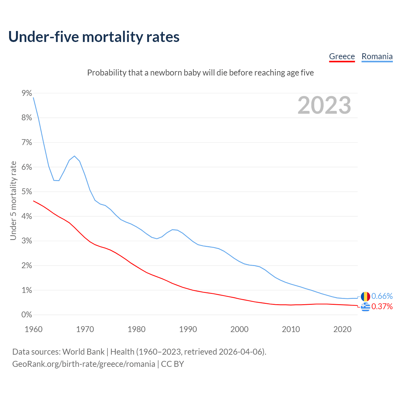 The chance that a newborn baby will die before reaching age five is 0.37% in Greece and 0.66% in Romania. Above is a chart with historical data on under-five mortality rates.