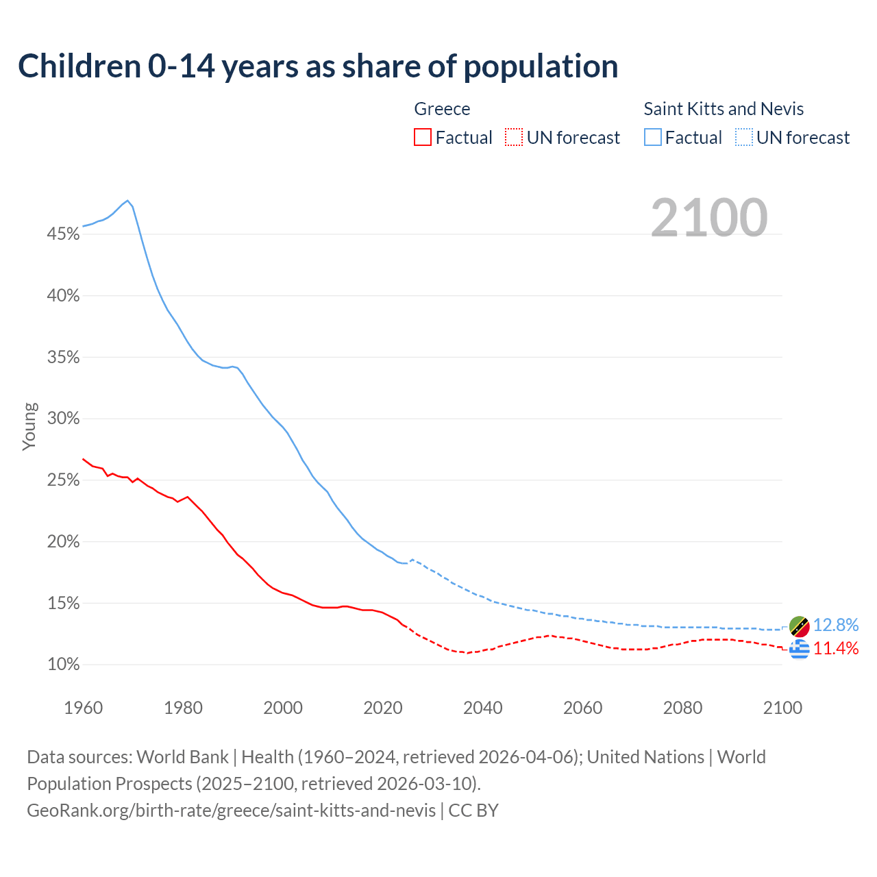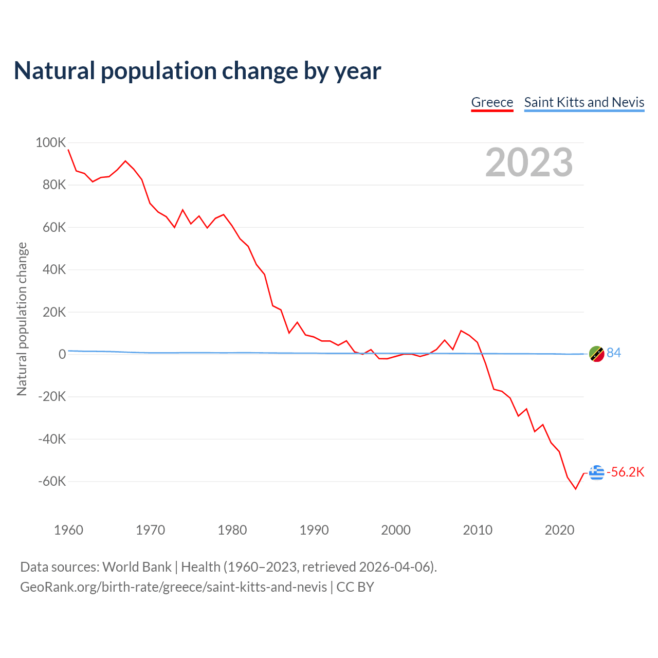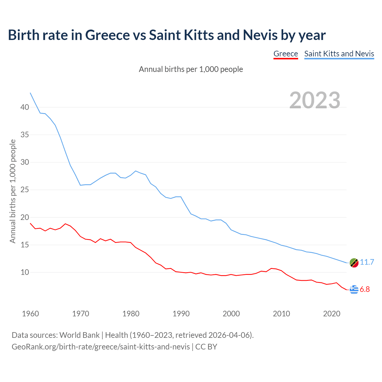 Greece has an annual birth rate of 6.8 births per 1,000 people, compared to 11.7 for Saint Kitts and Nevis. The average number of children a woman is expected to have during her lifetime — the fertility rate, is 1.32 in Greece and 1.51 in Saint Kitts and Nevis — 14% difference.