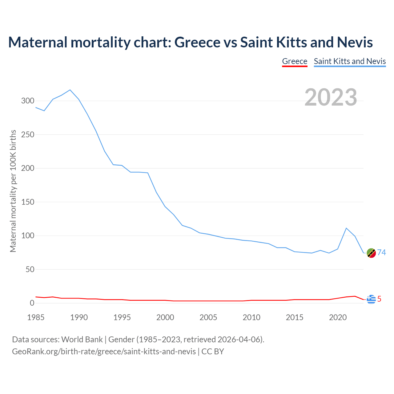 The maternal mortality rate, which is the probability of dying during childbirth or within 42 days of pregnancy termination, is 5 deaths per 100,000 live births in Greece, compared to 74 deaths in Saint Kitts and Nevis.