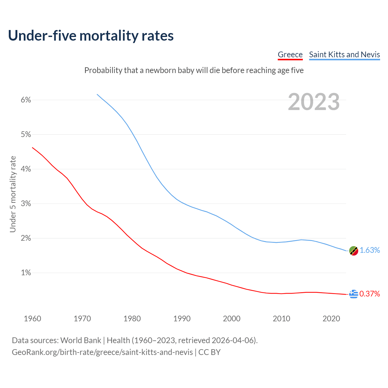 The chance that a newborn baby will die before reaching age five is 0.37% in Greece and 1.63% in Saint Kitts and Nevis. Above is a chart with historical data on under-five mortality rates.