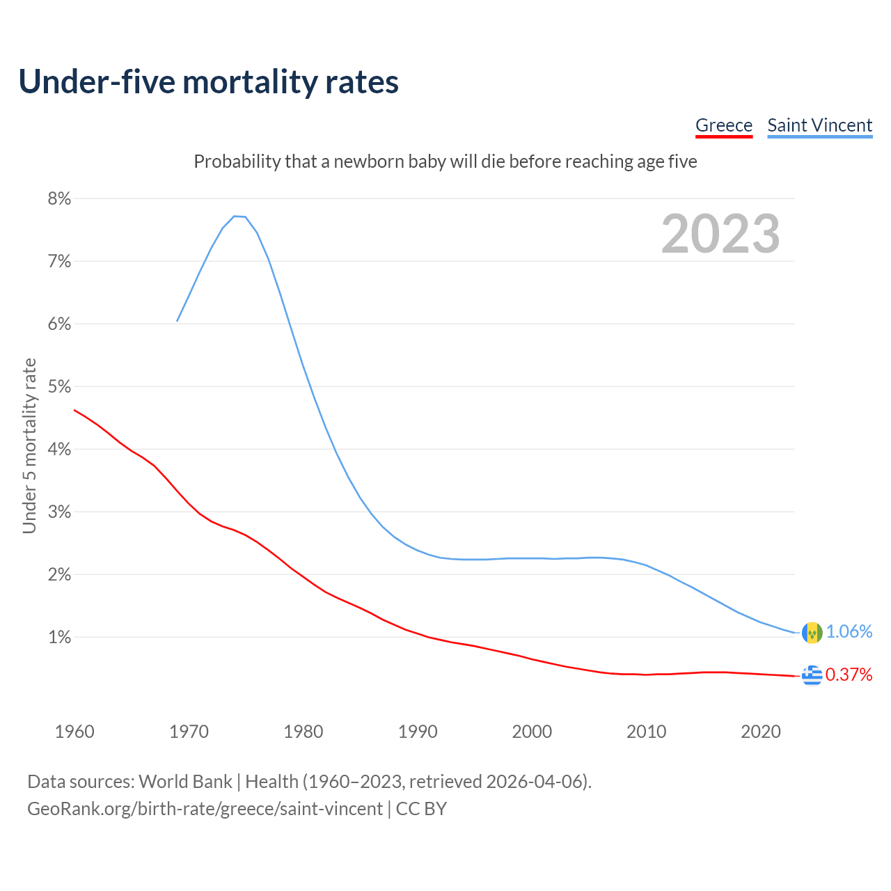 The chance that a newborn baby will die before reaching age five is 0.37% in Greece and 1.06% in Saint Vincent. Above is a chart with historical data on under-five mortality rates.
