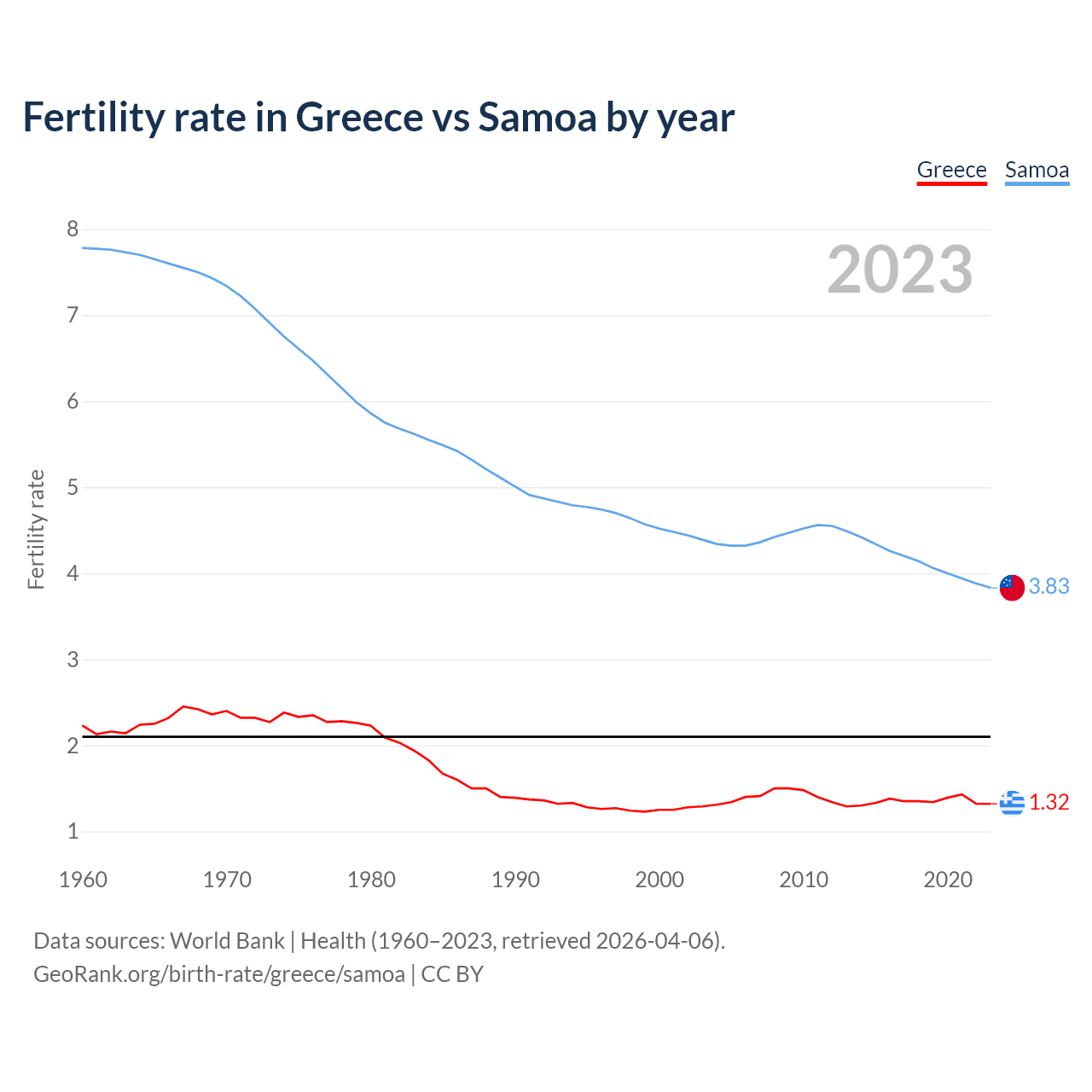 1960 vs 2023, the fertility rate has decreased by 40.8% in Greece and by 50.8% in Samoa — in 1960, it was 2.23 and 7.78, respectively.