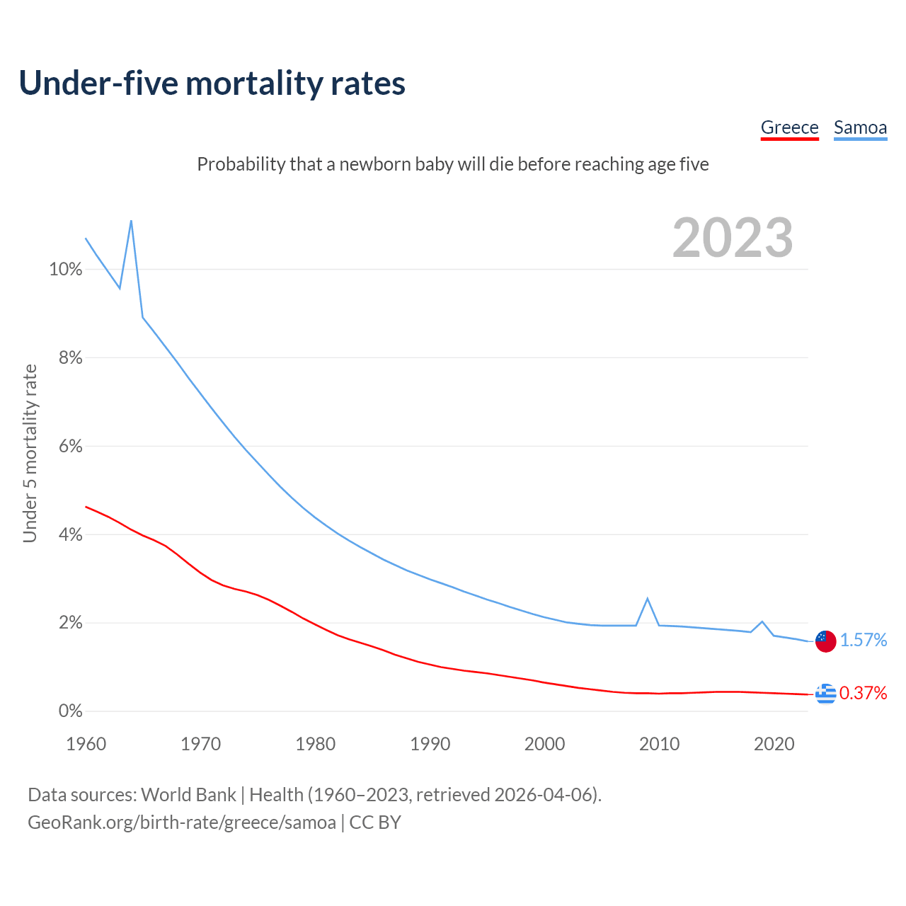 The chance that a newborn baby will die before reaching age five is 0.37% in Greece and 1.57% in Samoa. Above is a chart with historical data on under-five mortality rates.