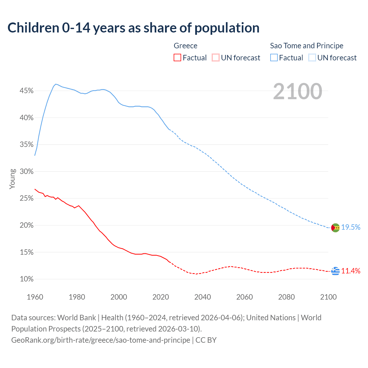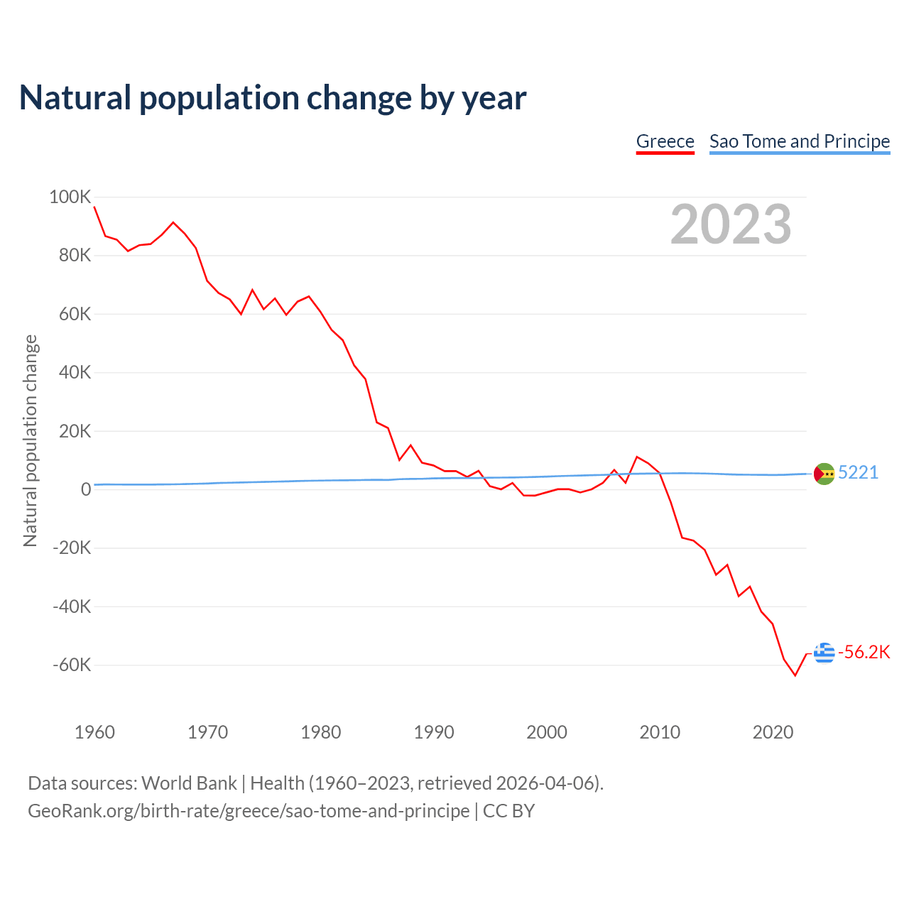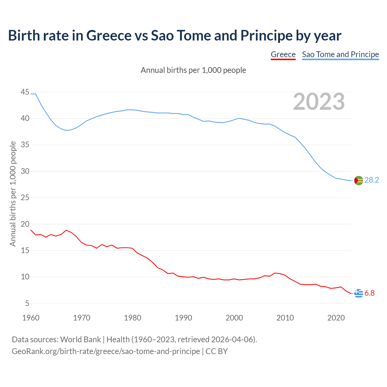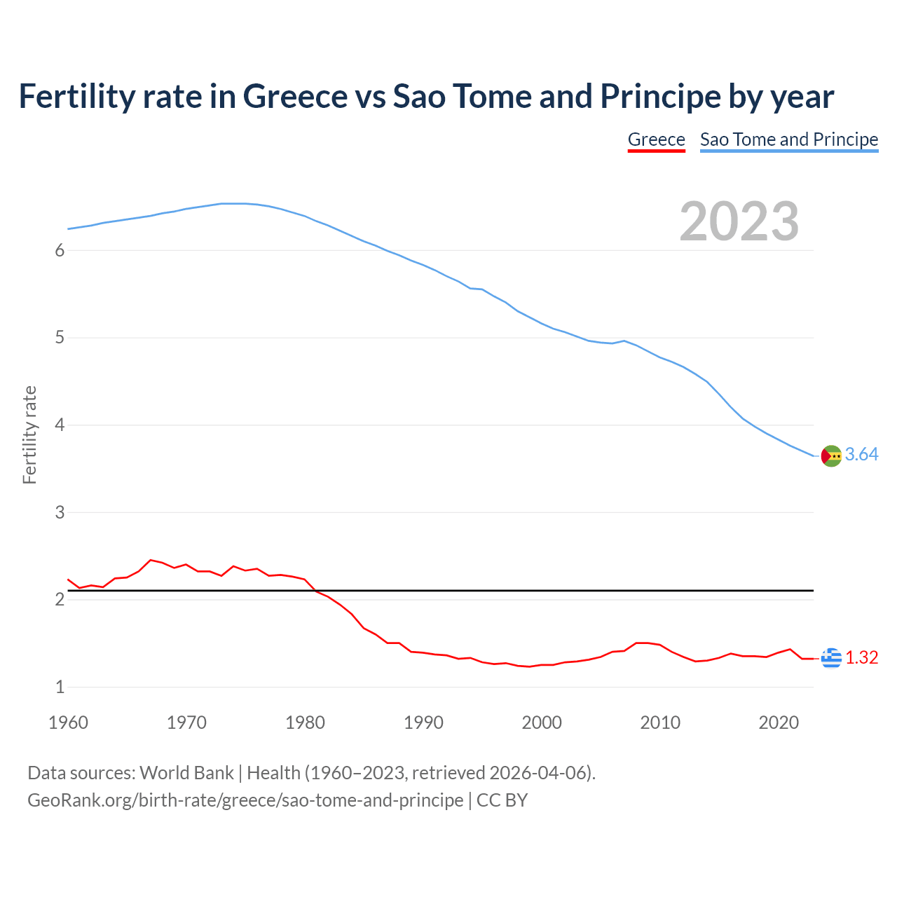Greece has an annual birth rate of 6.8 births per 1,000 people, compared to 28.2 for Sao Tome and Principe. The average number of children a woman is expected to have during her lifetime — the fertility rate, is 1.32 in Greece and 3.64 in Sao Tome and Principe — 176.1% difference.