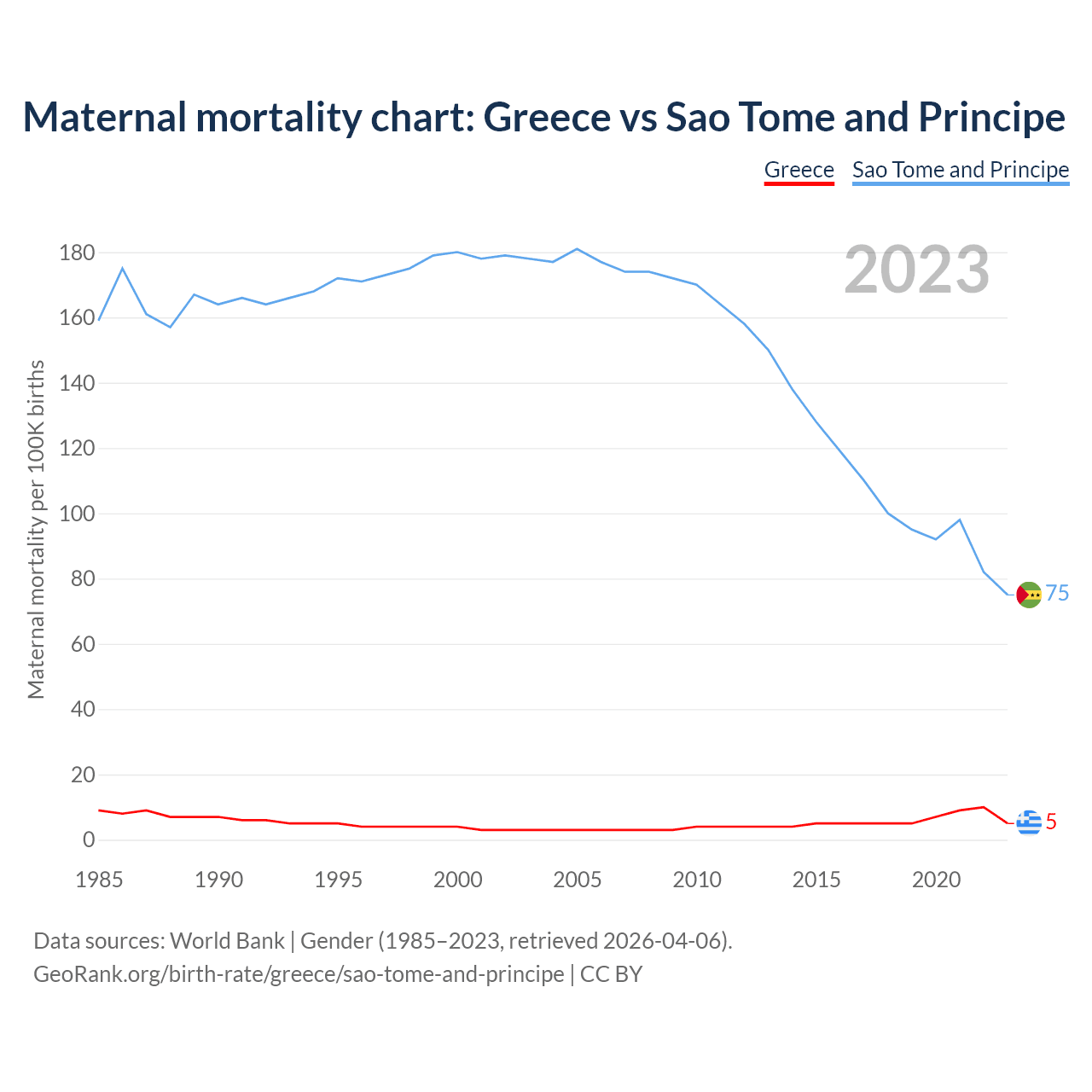 - Annual births per 1,000 women ages 15-19 (adolescent birth rate or teenage mother rate) is 7.04 in Greece vs 86.2 in Sao Tome and Principe.
