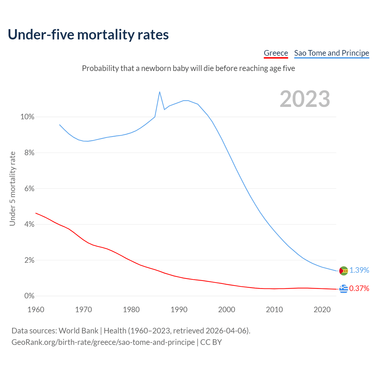 The chance that a newborn baby will die before reaching age five is 0.37% in Greece and 1.39% in Sao Tome and Principe. Above is a chart with historical data on under-five mortality rates.