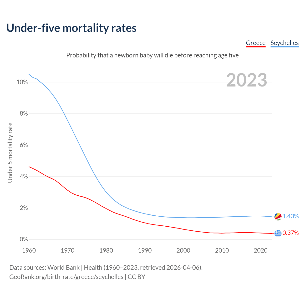 The chance that a newborn baby will die before reaching age five is 0.37% in Greece and 1.43% in the Seychelles. Above is a chart with historical data on under-five mortality rates.