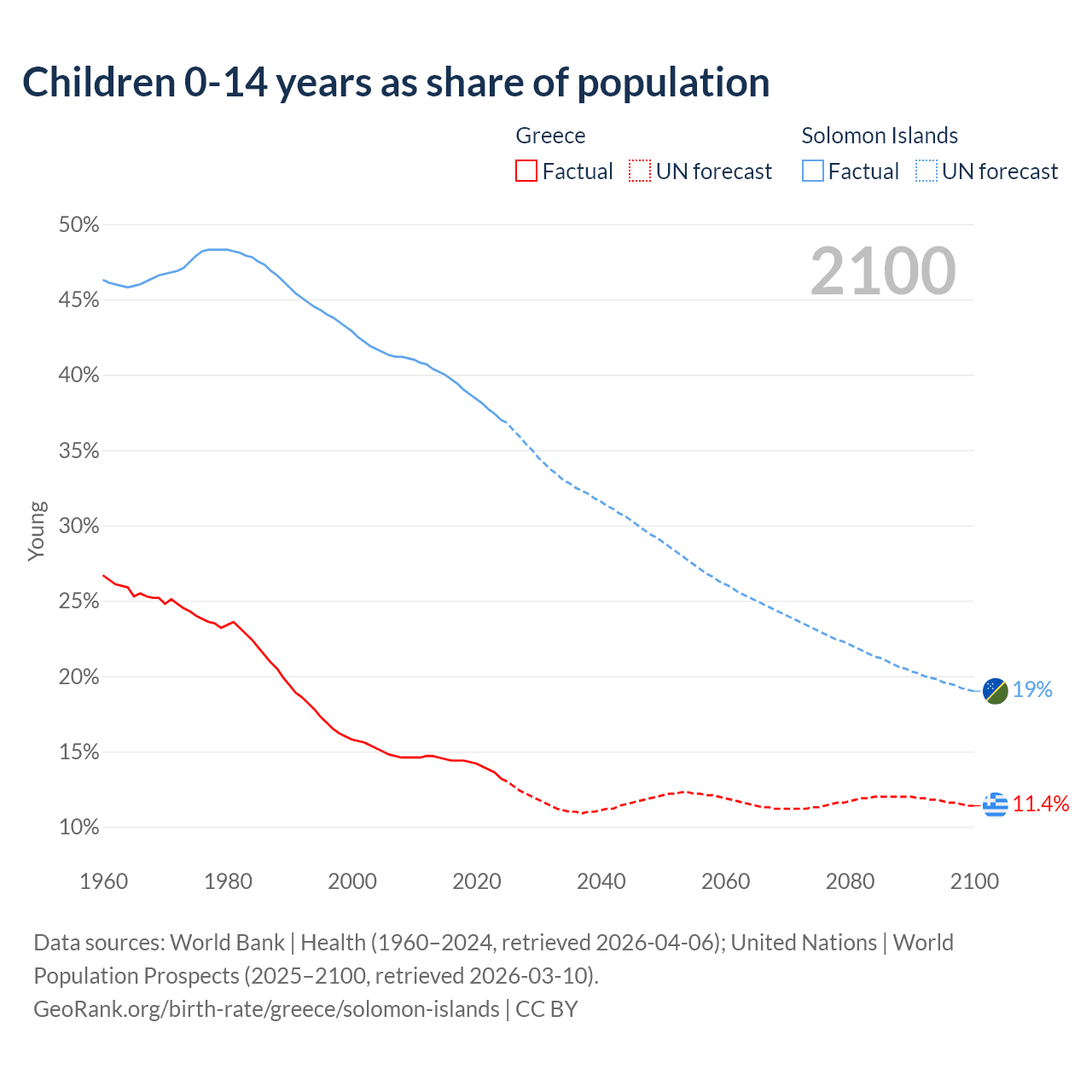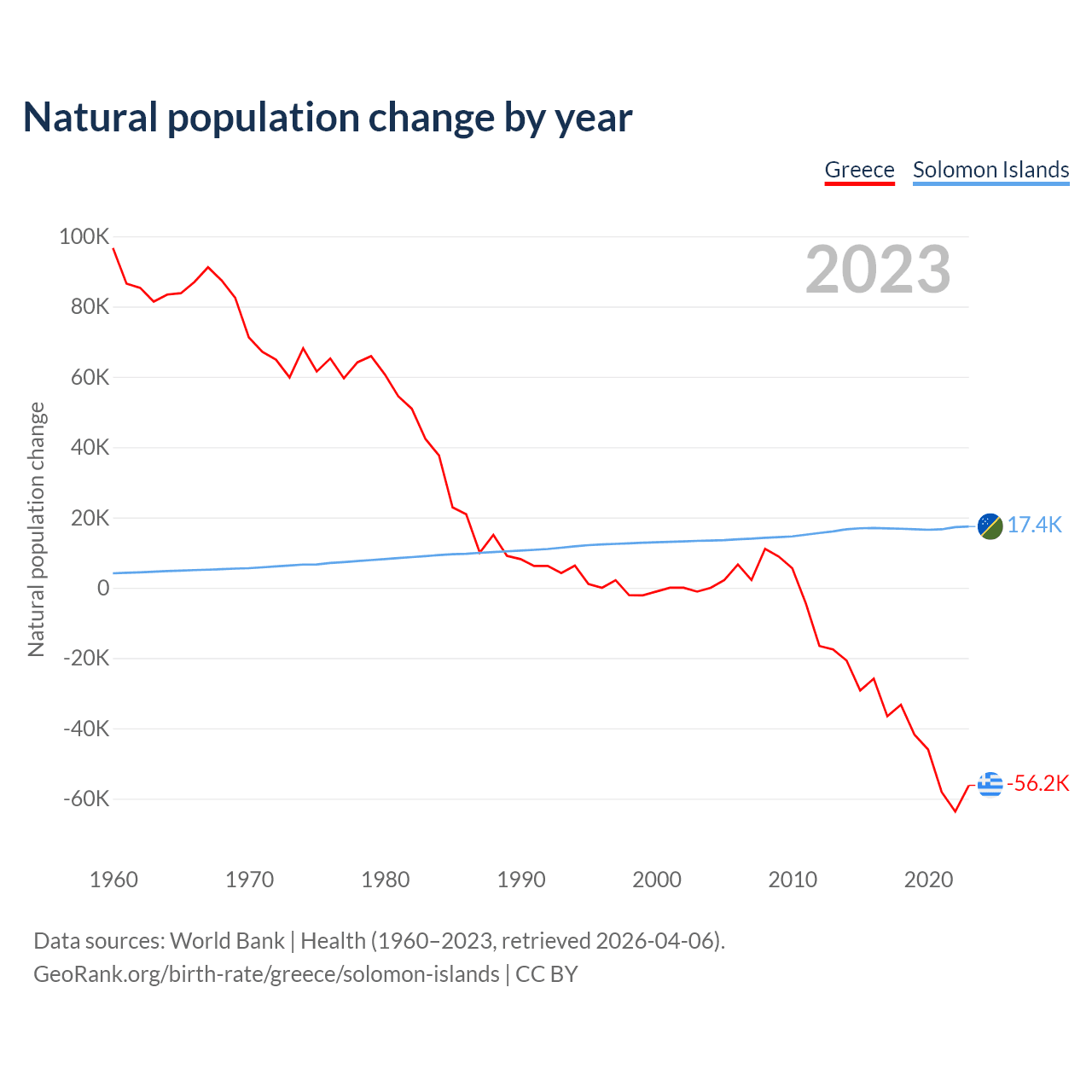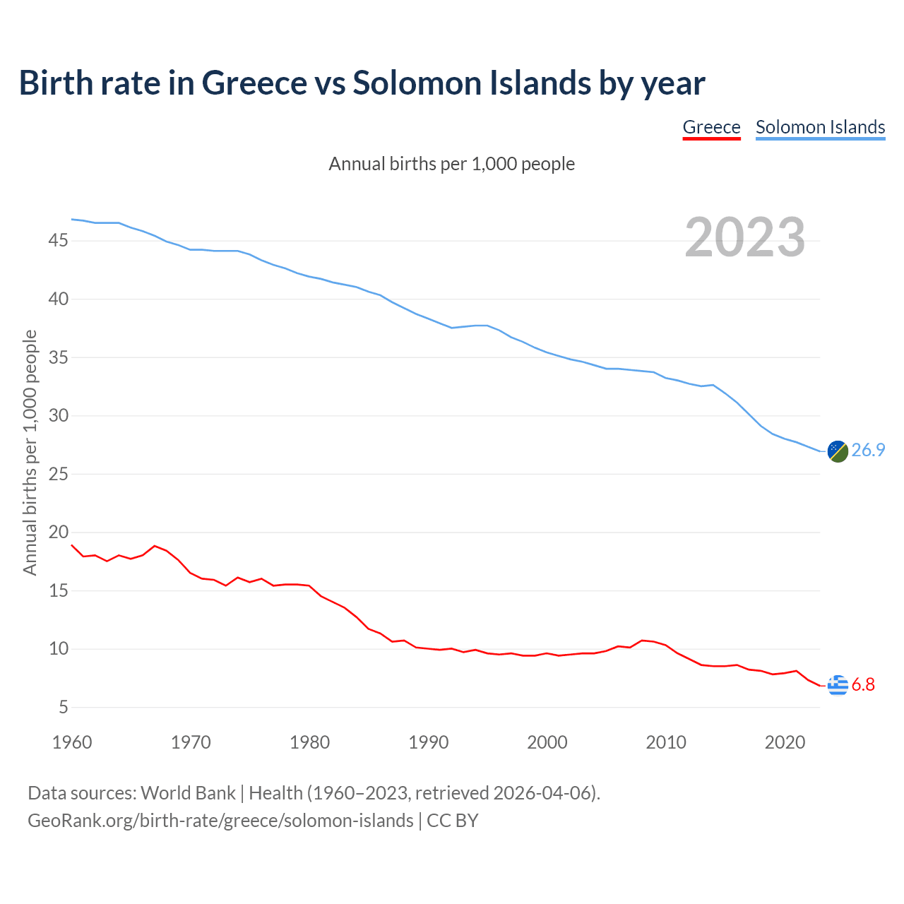 Greece has an annual birth rate of 6.8 births per 1,000 people, compared to 26.9 for the Solomon Islands. The average number of children a woman is expected to have during her lifetime — the fertility rate, is 1.32 in Greece and 3.56 in the Solomon Islands — 169.5% difference.