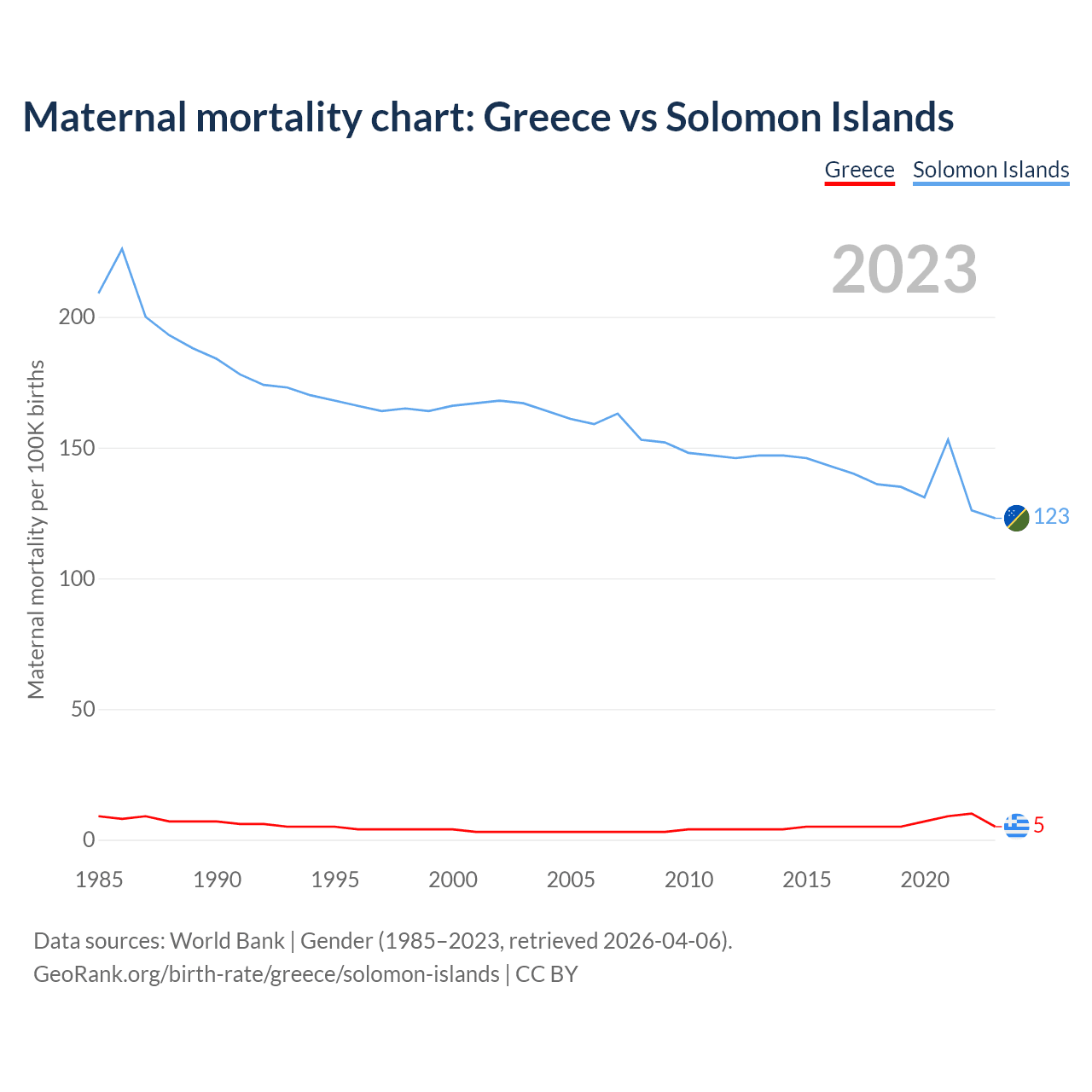 The maternal mortality rate, which is the probability of dying during childbirth or within 42 days of pregnancy termination, is 5 deaths per 100,000 live births in Greece, compared to 123 deaths in the Solomon Islands.