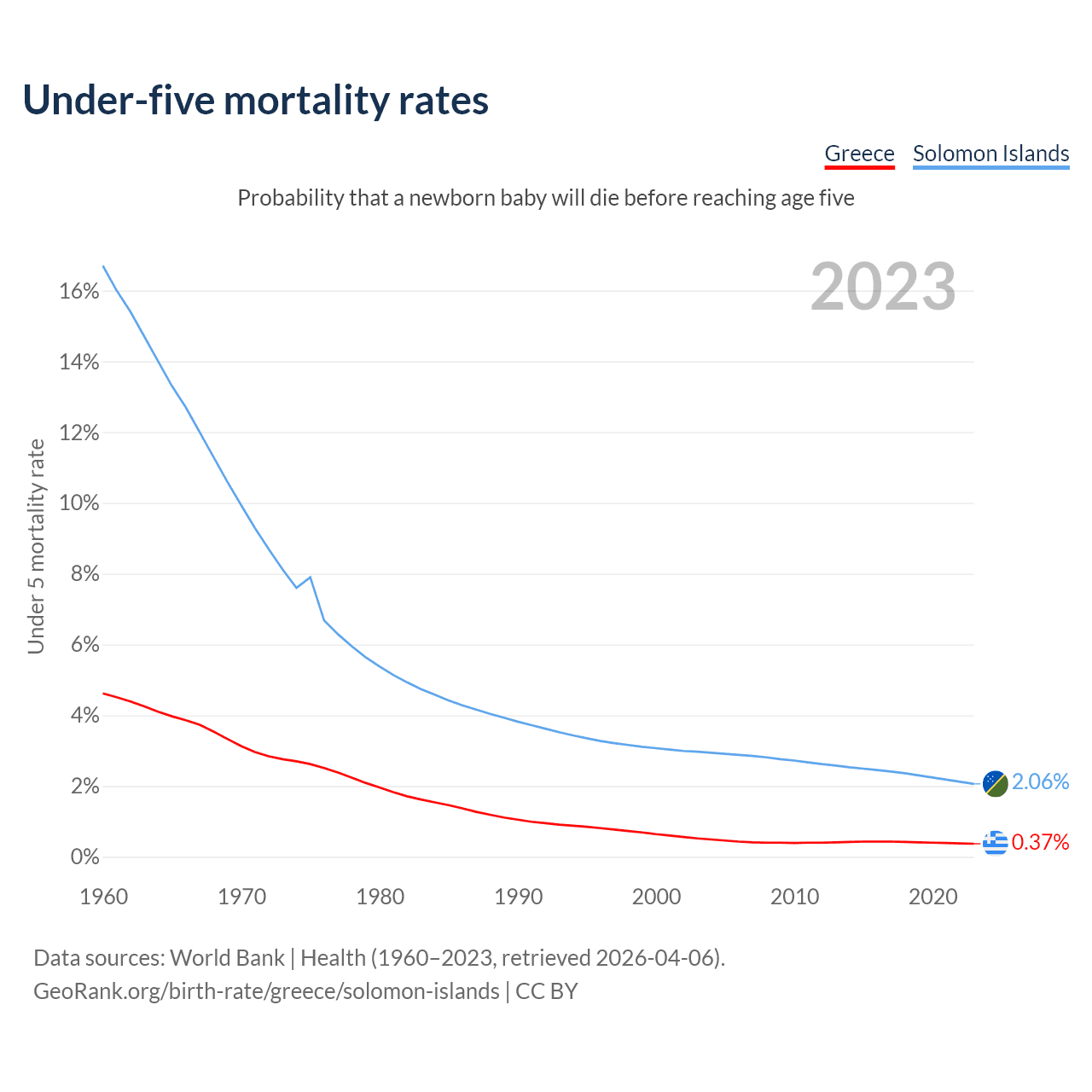 The chance that a newborn baby will die before reaching age five is 0.37% in Greece and 2.06% in the Solomon Islands. Above is a chart with historical data on under-five mortality rates.