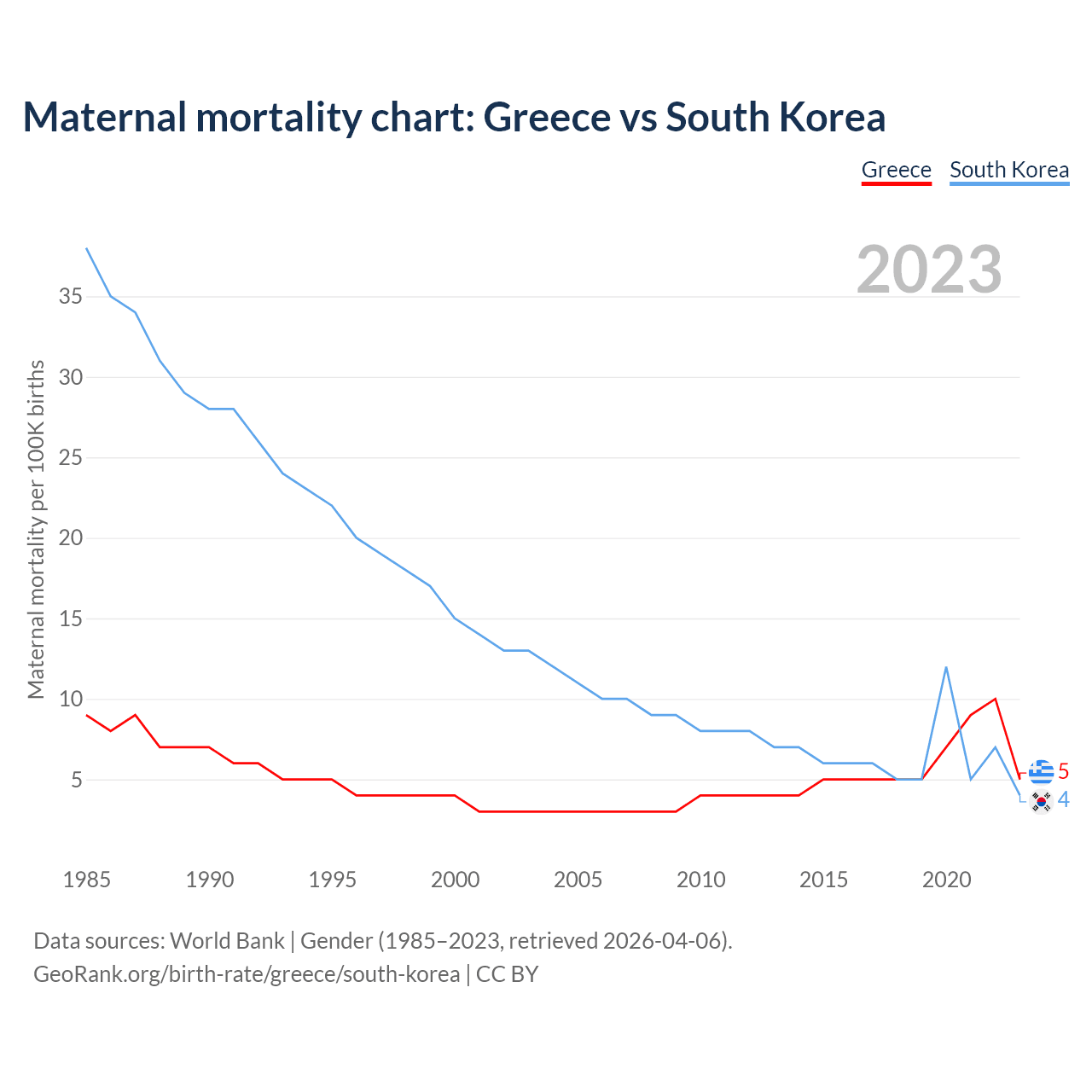 The maternal mortality rate, which is the probability of dying during childbirth or within 42 days of pregnancy termination, is 5 deaths per 100,000 live births in Greece, compared to 4 deaths in South Korea.