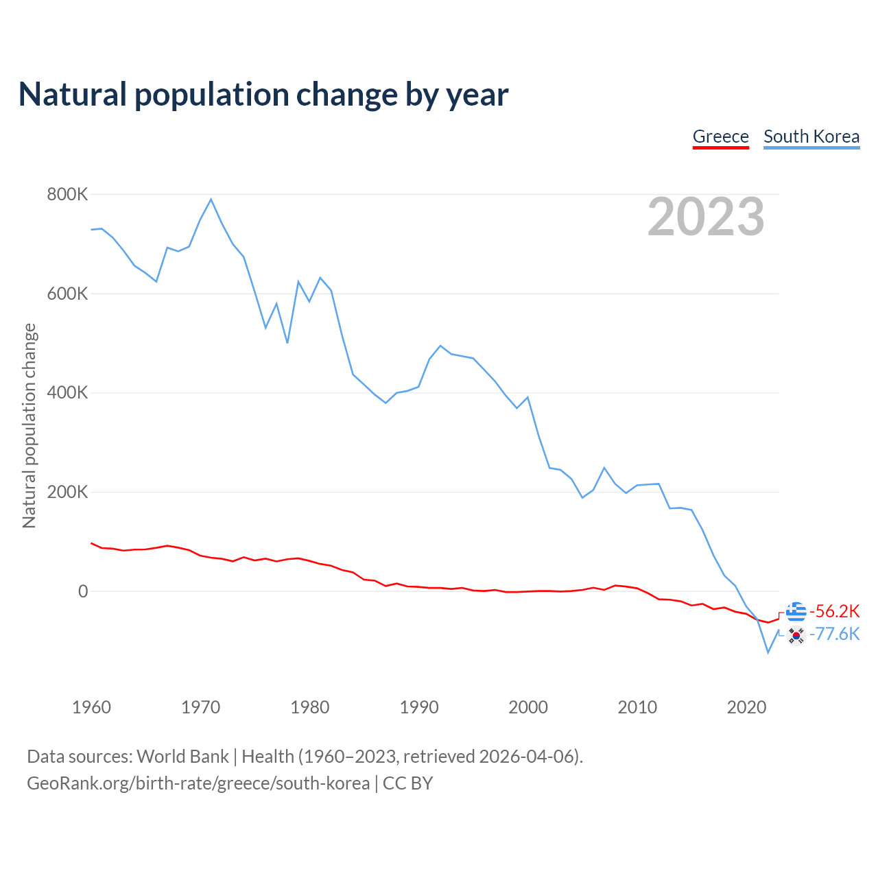 1960 vs 2023, the fertility rate has decreased by 40.8% in Greece and by 88% in South Korea — in 1960, it was 2.23 and 5.99, respectively.