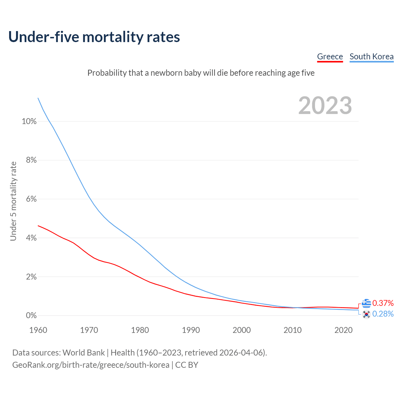 The chance that a newborn baby will die before reaching age five is 0.37% in Greece and 0.28% in South Korea. Above is a chart with historical data on under-five mortality rates.