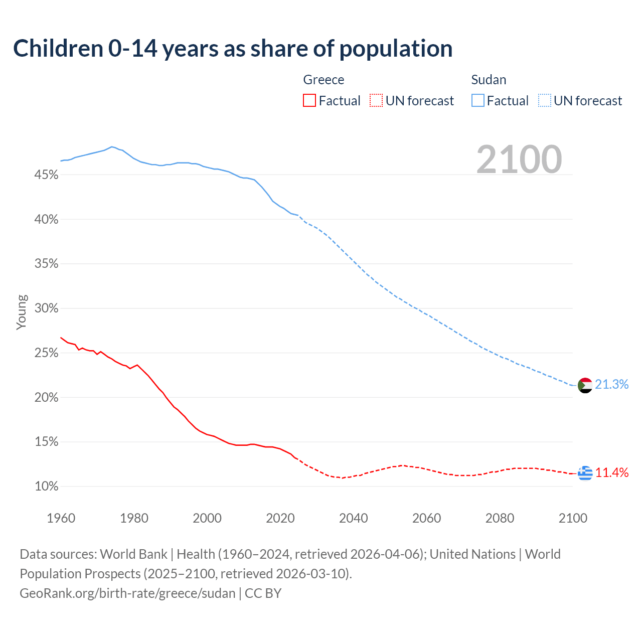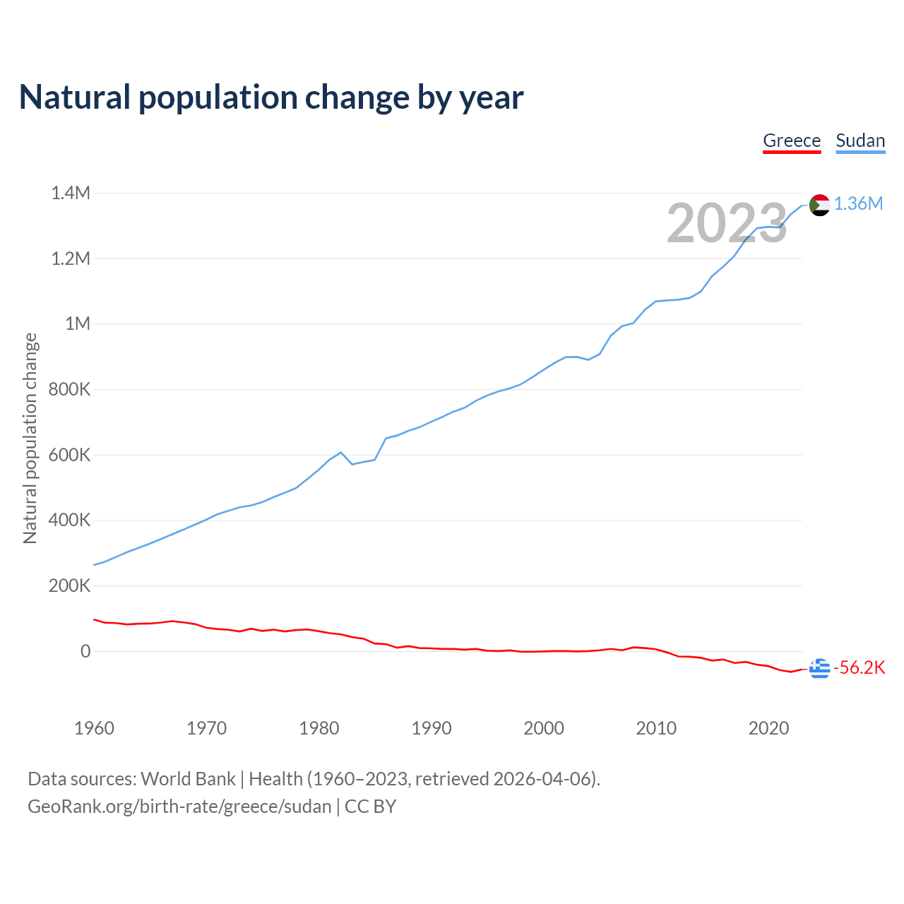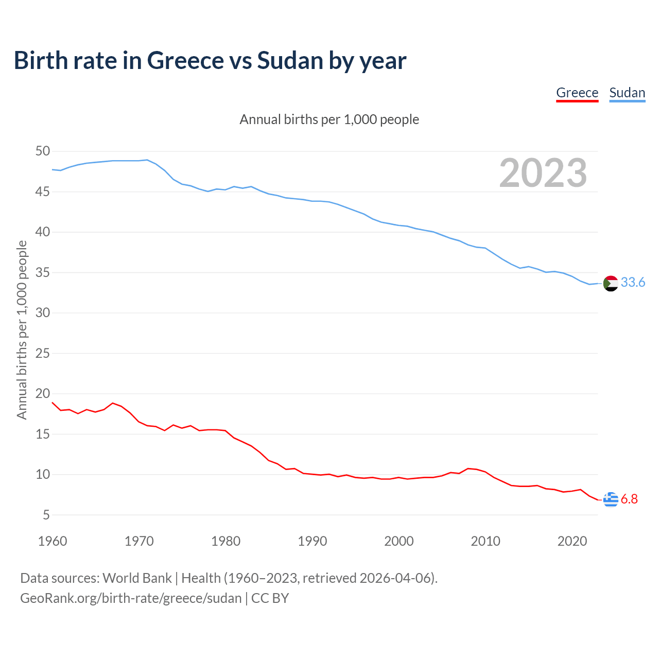 Greece has an annual birth rate of 6.8 births per 1,000 people, compared to 33.6 for Sudan. The average number of children a woman is expected to have during her lifetime — the fertility rate, is 1.32 in Greece and 4.32 in Sudan — 227.5% difference.