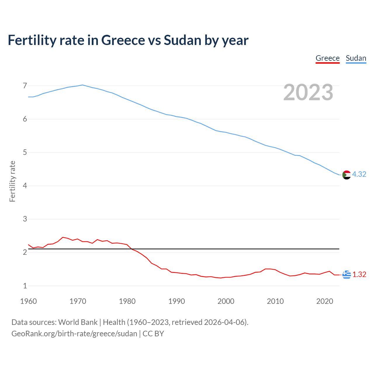According to the latest available data on birth rates, the fertility rate in Greece was 1.32 children per woman in 2023, compared to 4.32 in Sudan in 2023. The replacement level is considered to be 2.1 children per woman.