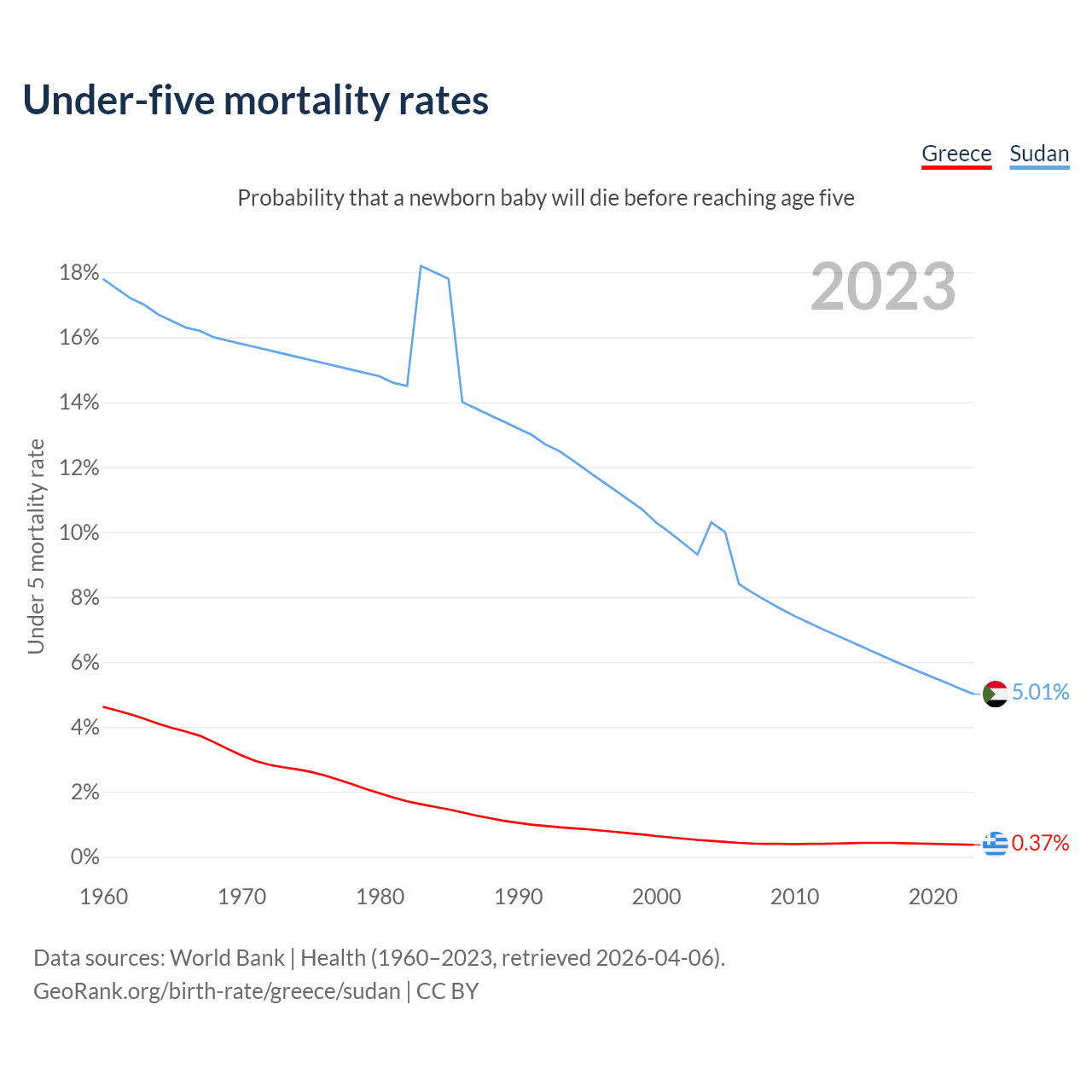 The chance that a newborn baby will die before reaching age five is 0.37% in Greece and 5.01% in Sudan. Above is a chart with historical data on under-five mortality rates.