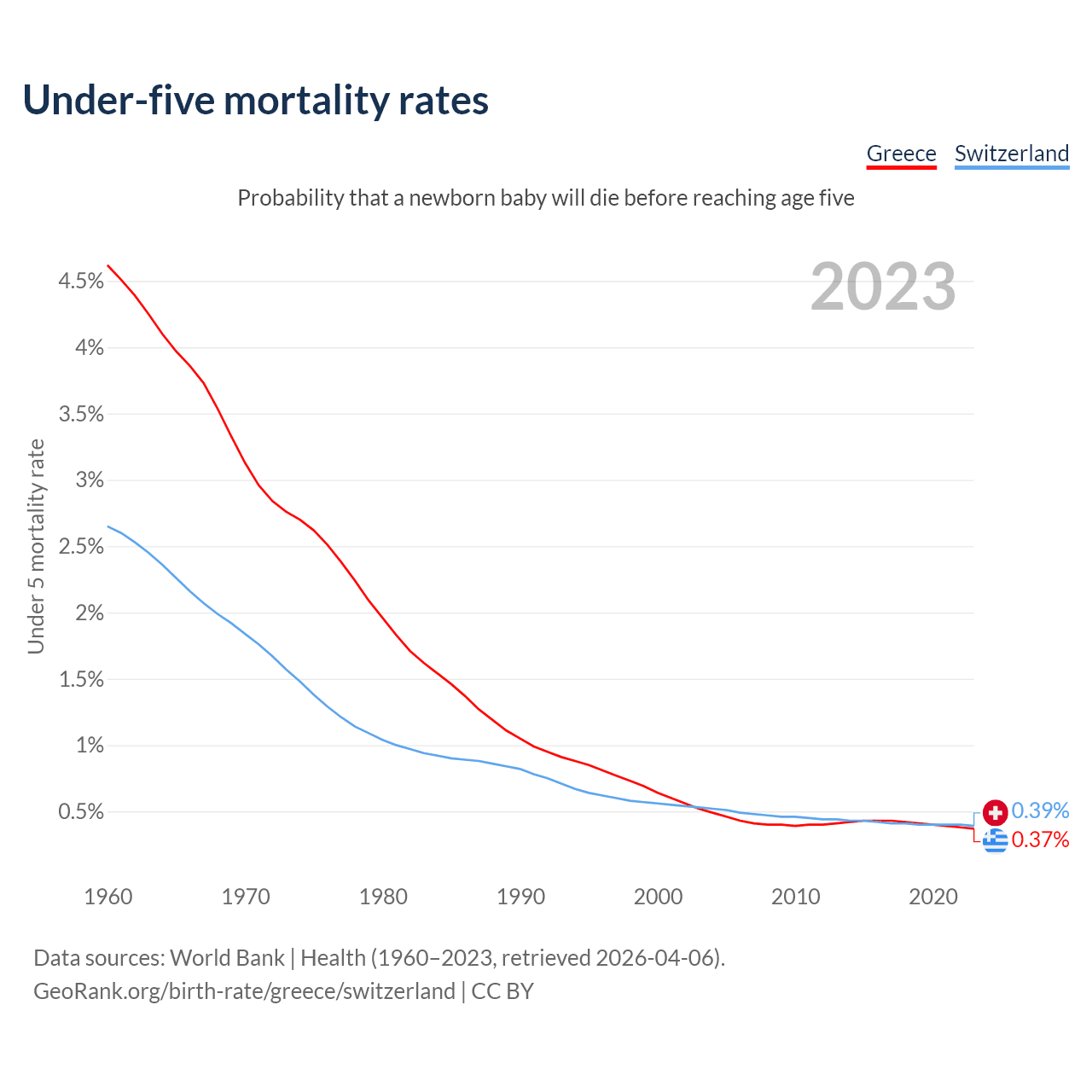 The chance that a newborn baby will die before reaching age five is 0.37% in Greece and 0.39% in Switzerland. Above is a chart with historical data on under-five mortality rates.