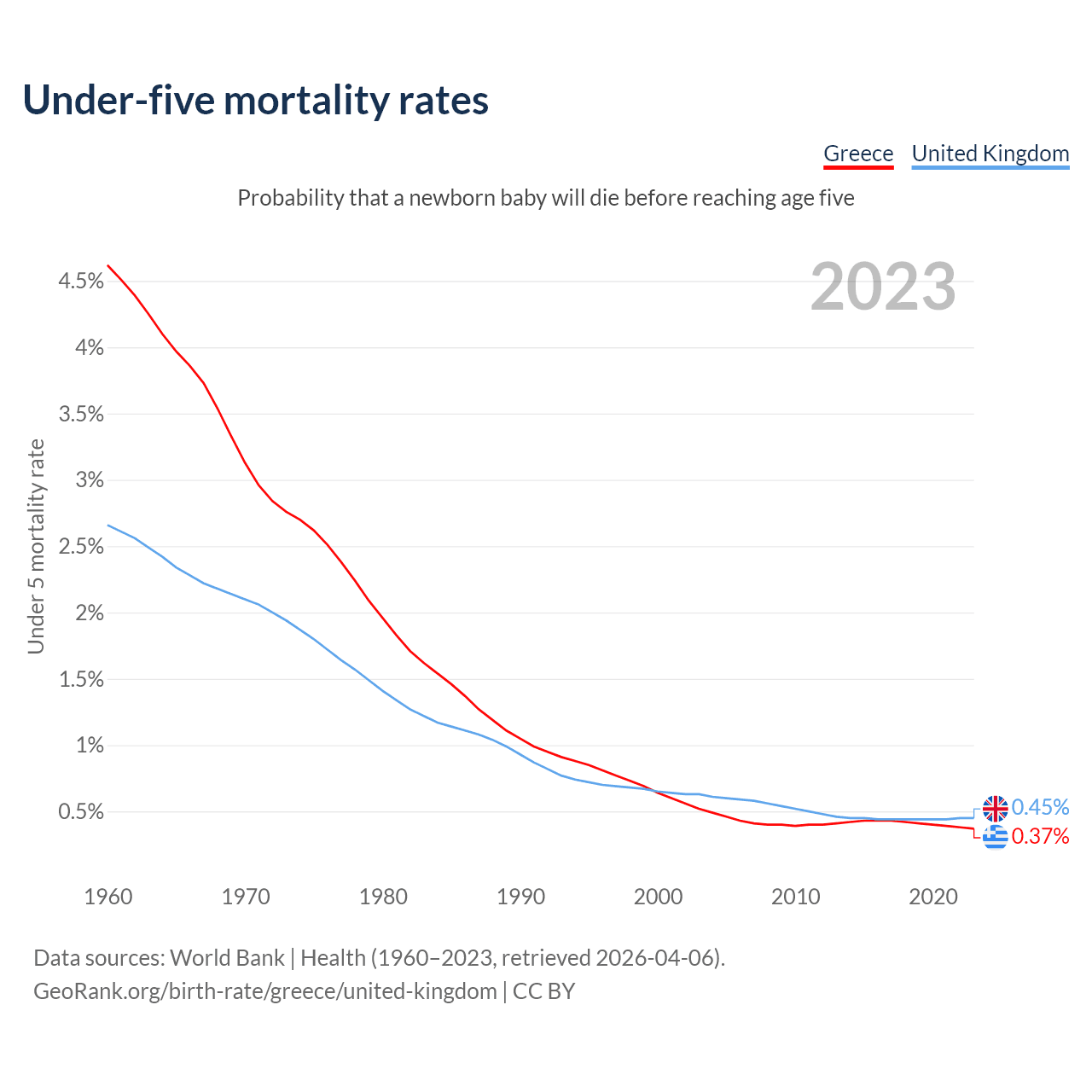 The chance that a newborn baby will die before reaching age five is 0.37% in Greece and 0.45% in the United Kingdom. Above is a chart with historical data on under-five mortality rates.