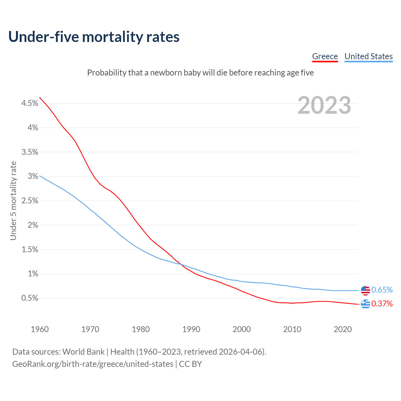 The chance that a newborn baby will die before reaching age five is 0.37% in Greece and 0.65% in the United States. Above is a chart with historical data on under-five mortality rates.