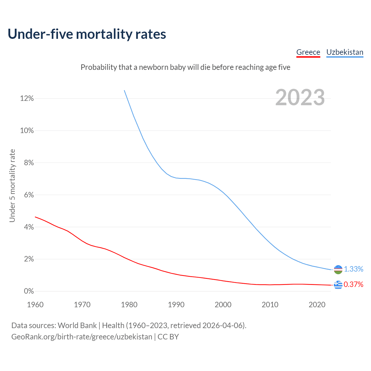 The chance that a newborn baby will die before reaching age five is 0.37% in Greece and 1.33% in Uzbekistan. Above is a chart with historical data on under-five mortality rates.