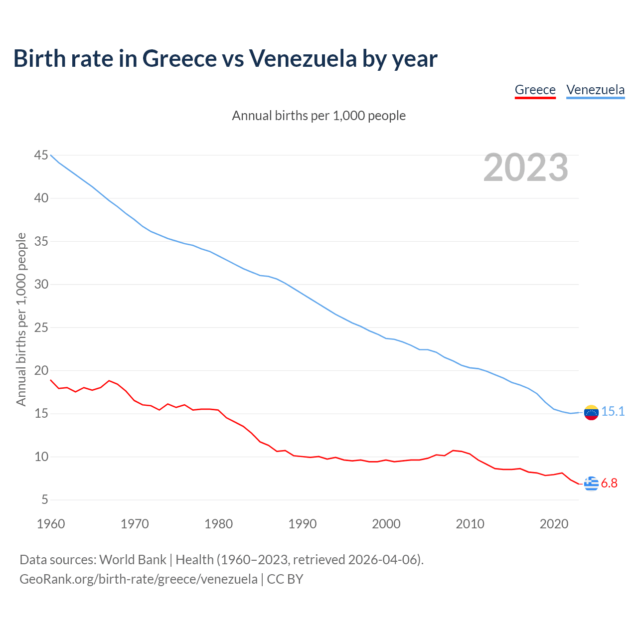 Greece has an annual birth rate of 6.8 births per 1,000 people, compared to 15.1 for Venezuela. The average number of children a woman is expected to have during her lifetime — the fertility rate, is 1.32 in Greece and 2.08 in Venezuela — 57.5% difference.