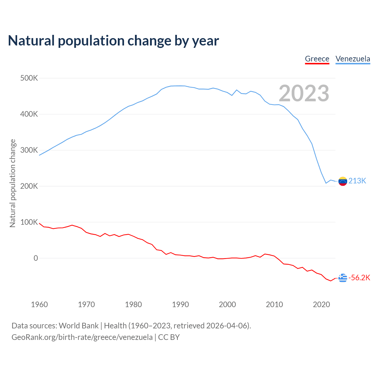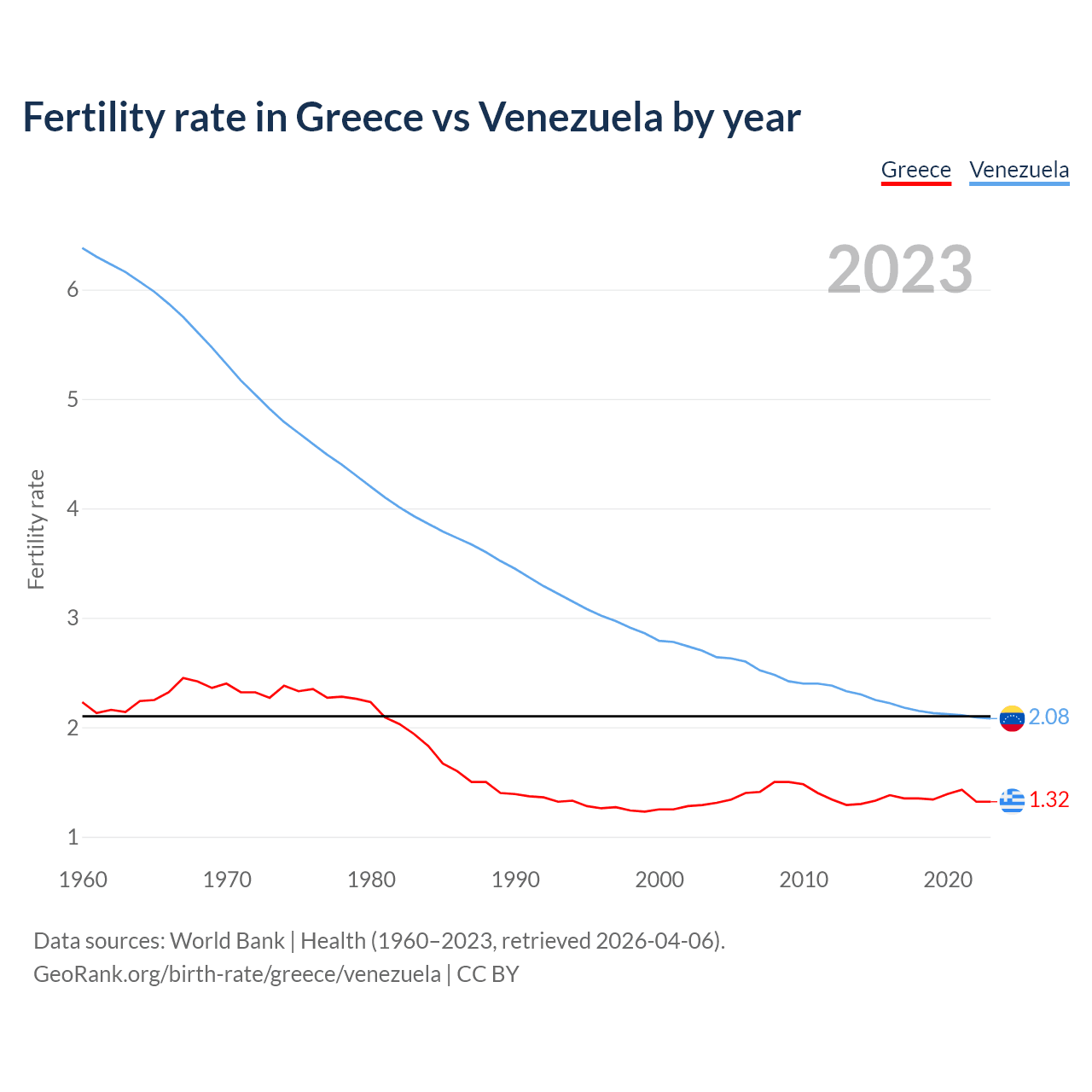According to the latest available data on birth rates, the fertility rate in Greece was 1.32 children per woman in 2023, compared to 2.08 in Venezuela in 2023. The replacement level is considered to be 2.1 children per woman.