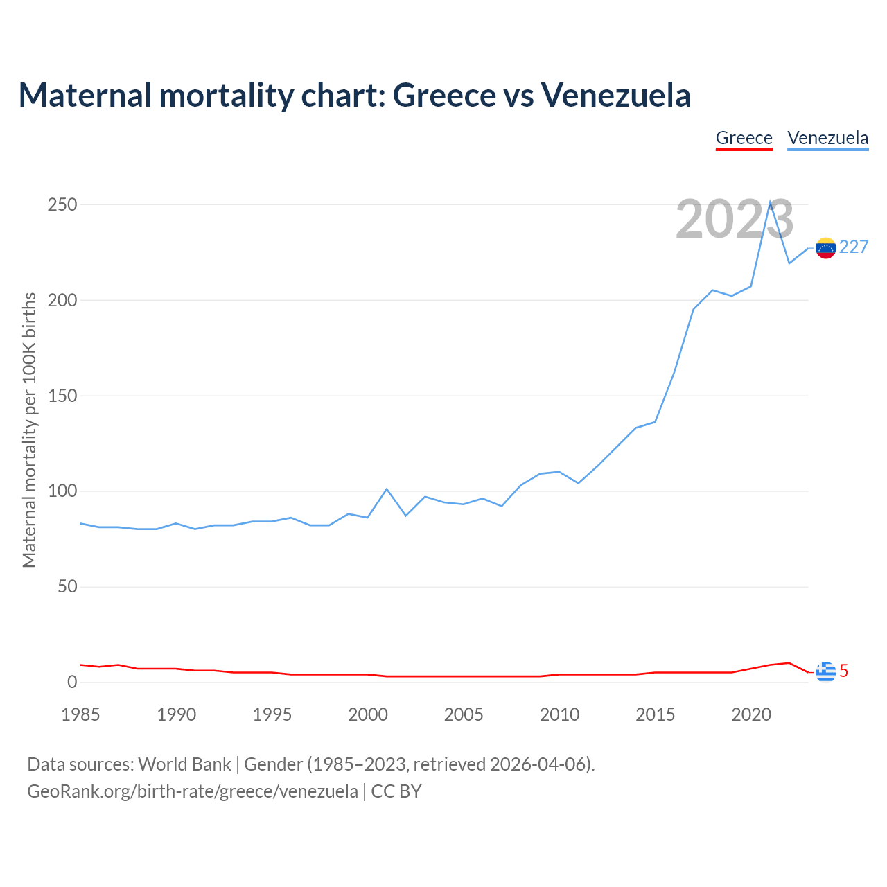 The maternal mortality rate, which is the probability of dying during childbirth or within 42 days of pregnancy termination, is 5 deaths per 100,000 live births in Greece, compared to 227 deaths in Venezuela.