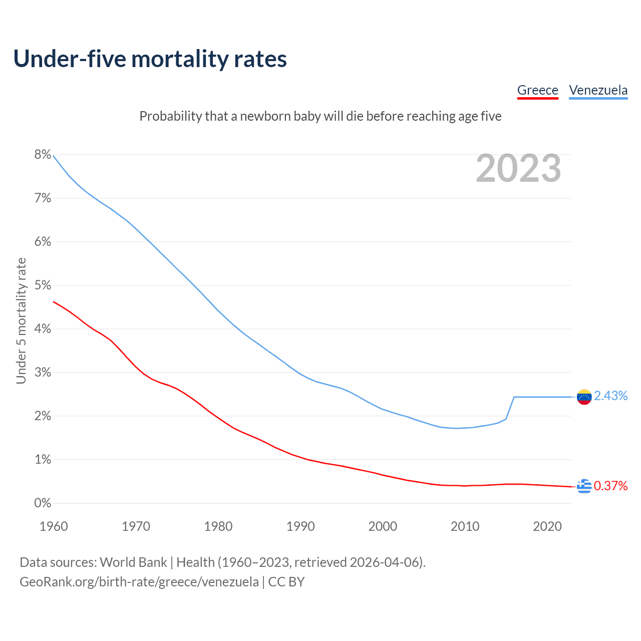 The chance that a newborn baby will die before reaching age five is 0.37% in Greece and 2.43% in Venezuela. Above is a chart with historical data on under-five mortality rates.