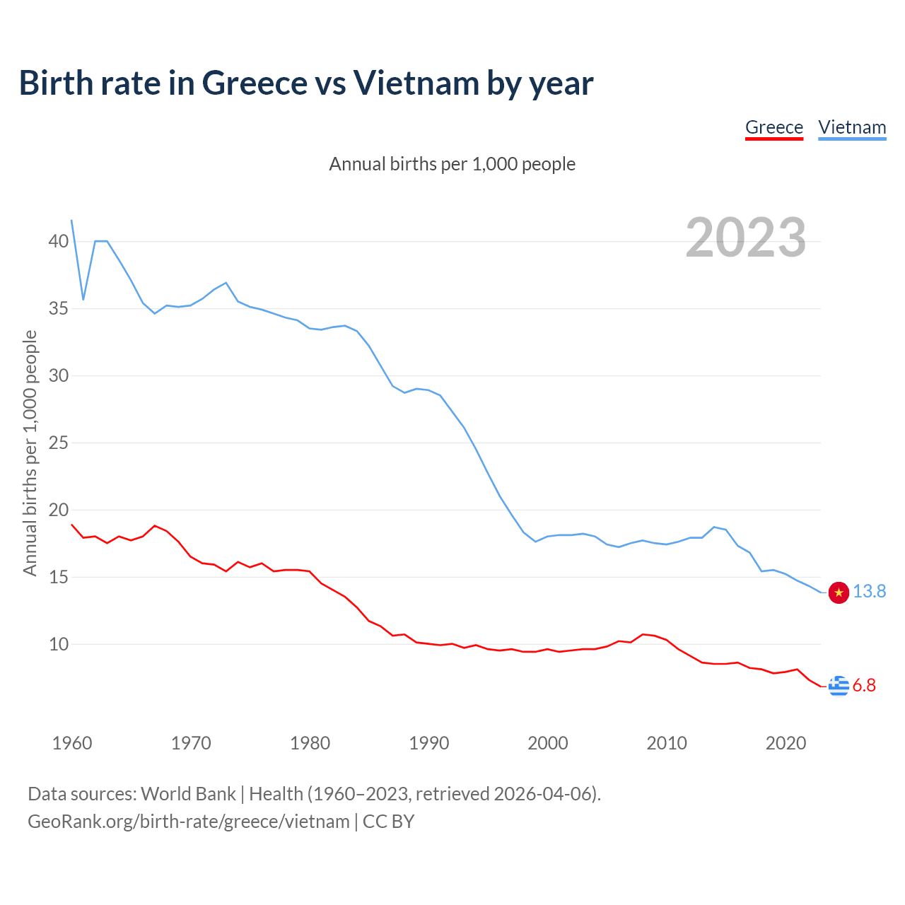 Greece has an annual birth rate of 6.8 births per 1,000 people, compared to 13.8 for Vietnam. The average number of children a woman is expected to have during her lifetime — the fertility rate, is 1.32 in Greece and 1.91 in Vietnam — 44.9% difference.