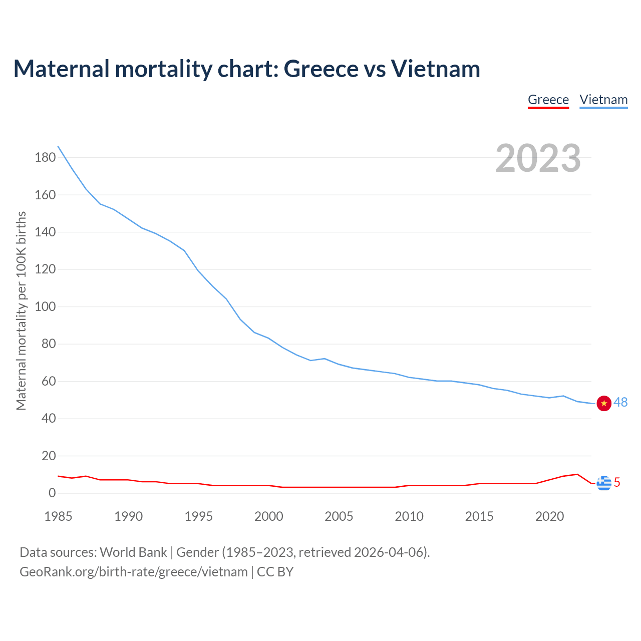 The maternal mortality rate, which is the probability of dying during childbirth or within 42 days of pregnancy termination, is 5 deaths per 100,000 live births in Greece, compared to 48 deaths in Vietnam.