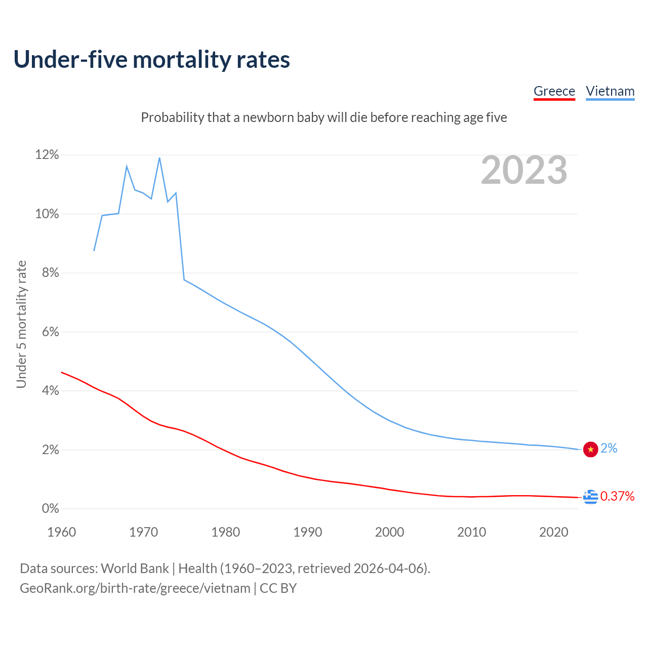 The chance that a newborn baby will die before reaching age five is 0.37% in Greece and 2% in Vietnam. Above is a chart with historical data on under-five mortality rates.