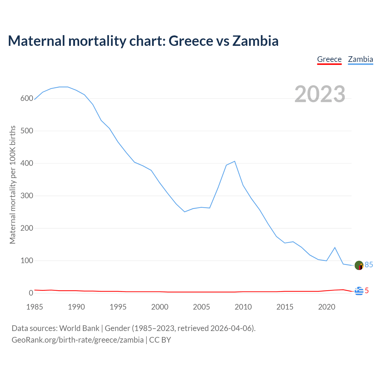 The maternal mortality rate, which is the probability of dying during childbirth or within 42 days of pregnancy termination, is 5 deaths per 100,000 live births in Greece, compared to 85 deaths in Zambia.