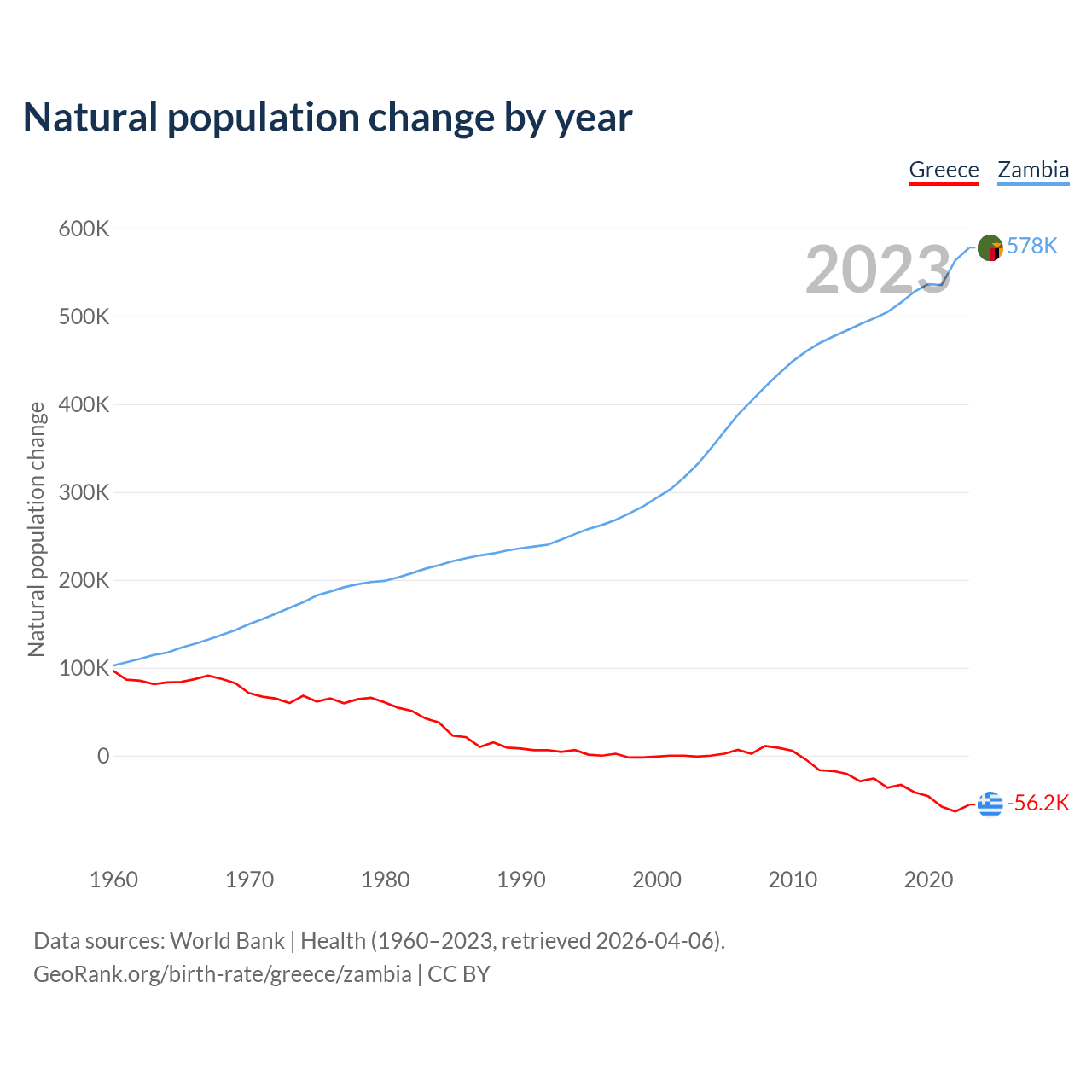 Greece has an annual birth rate of 6.8 births per 1,000 people, compared to 33.1 for Zambia. The average number of children a woman is expected to have during her lifetime — the fertility rate, is 1.32 in Greece and 4.1 in Zambia — 210.7% difference.