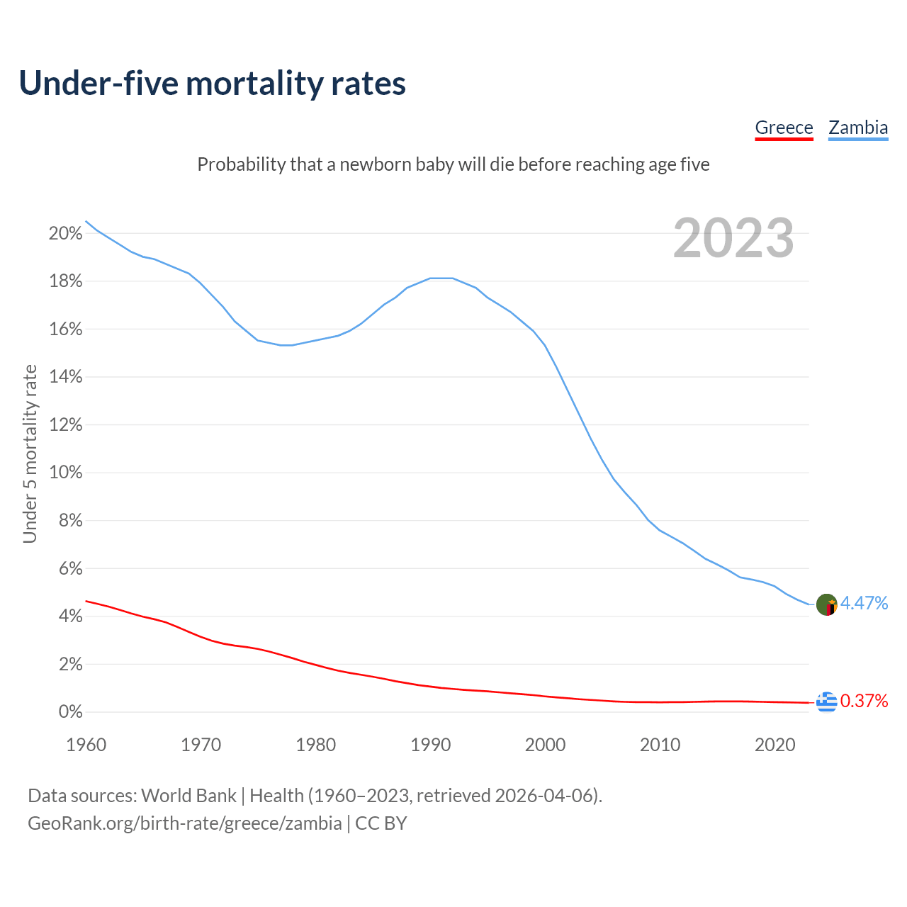 The chance that a newborn baby will die before reaching age five is 0.37% in Greece and 4.47% in Zambia. Above is a chart with historical data on under-five mortality rates.