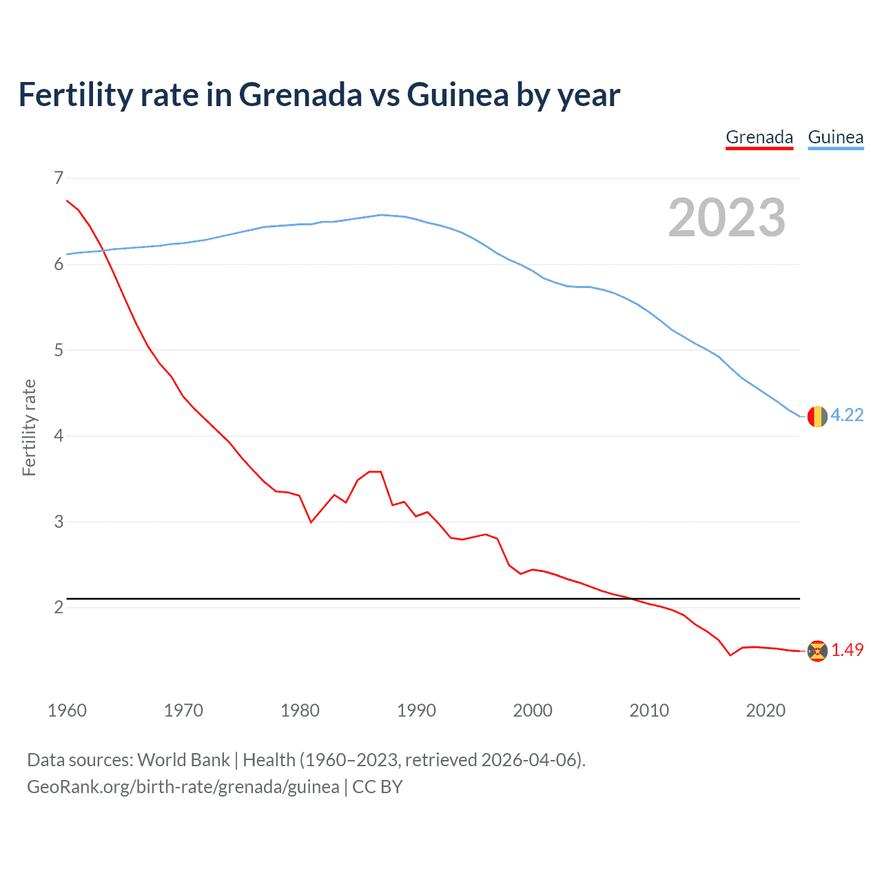 According to the latest available data on birth rates, the fertility rate in Grenada was 1.49 children per woman in 2023, compared to 4.22 in Guinea in 2023. The replacement level is considered to be 2.1 children per woman.