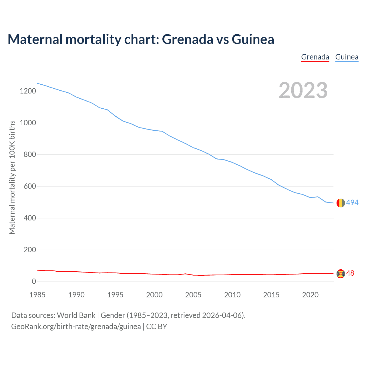The maternal mortality rate, which is the probability of dying during childbirth or within 42 days of pregnancy termination, is 48 deaths per 100,000 live births in Grenada, compared to 494 deaths in Guinea.
