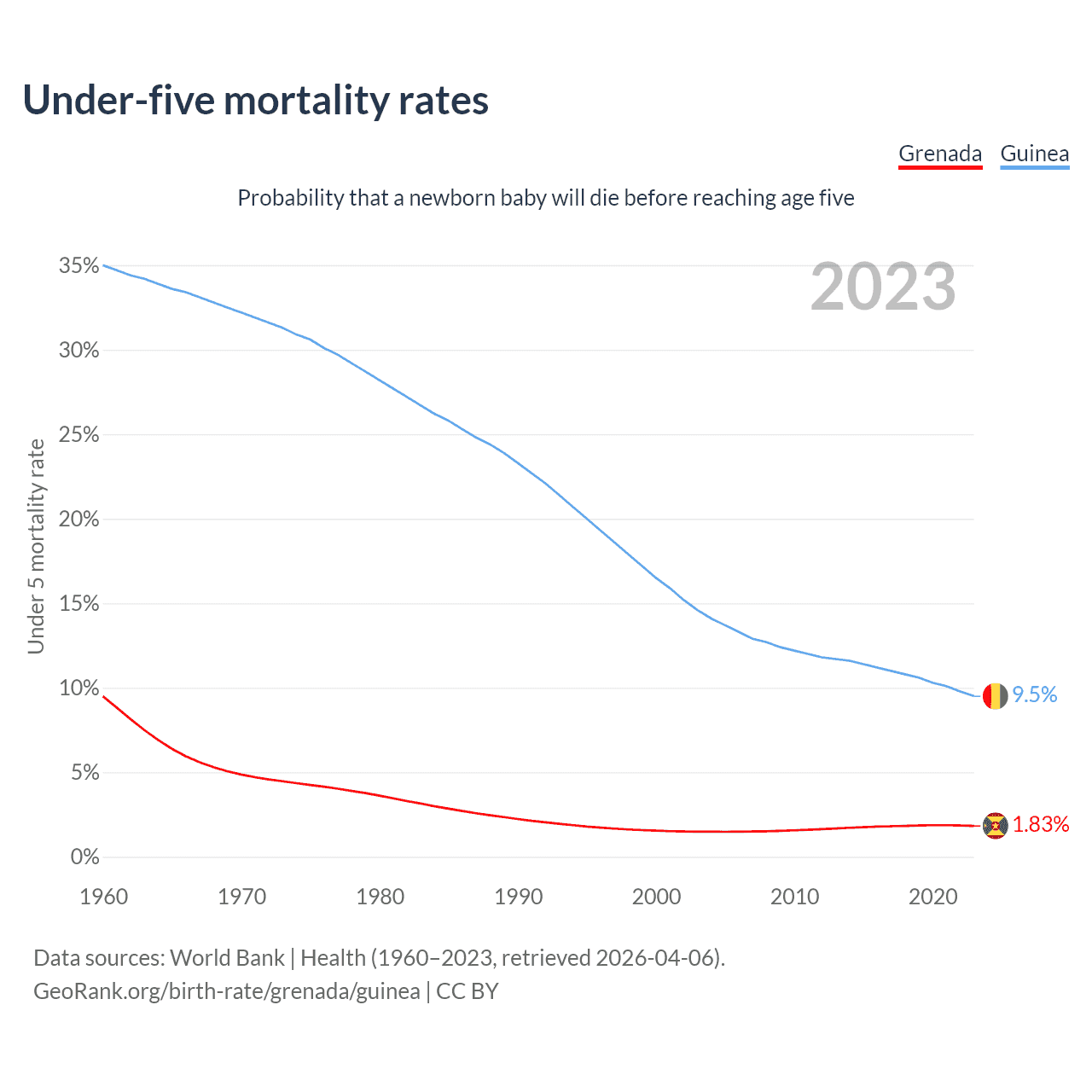 The chance that a newborn baby will die before reaching age five is 1.83% in Grenada and 9.5% in Guinea. Above is a chart with historical data on under-five mortality rates.
