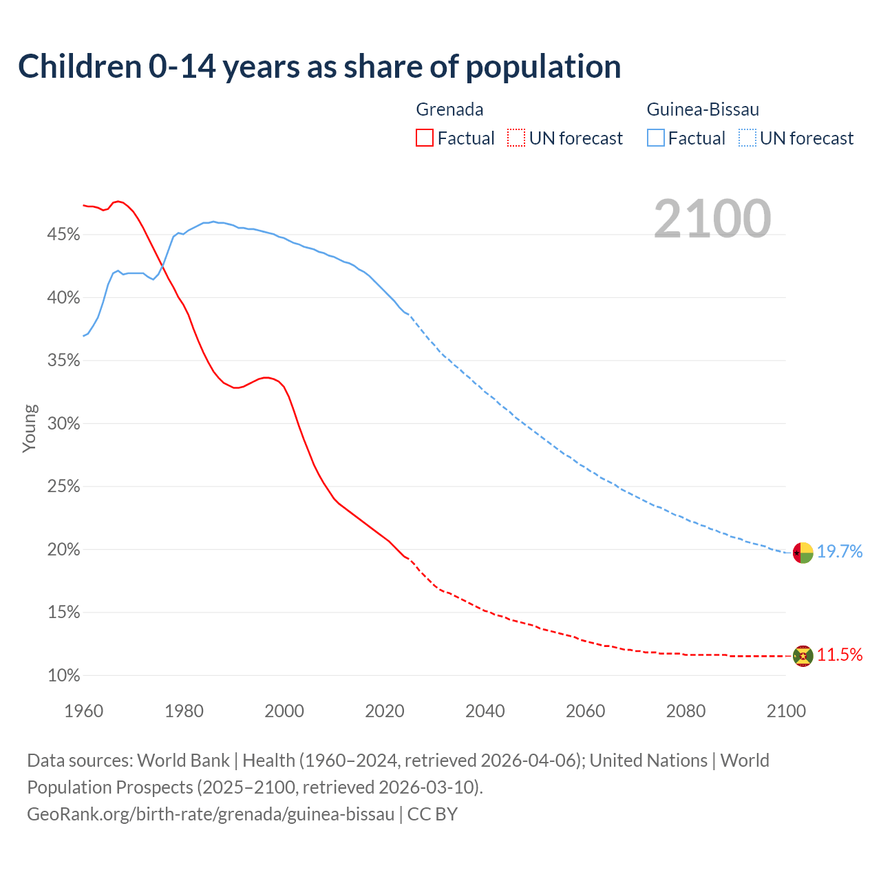 Grenada has an annual birth rate of 11.7 births per 1,000 people, compared to 30 for Guinea-Bissau. The average number of children a woman is expected to have during her lifetime — the fertility rate, is 1.49 in Grenada and 3.84 in Guinea-Bissau — 158% difference.