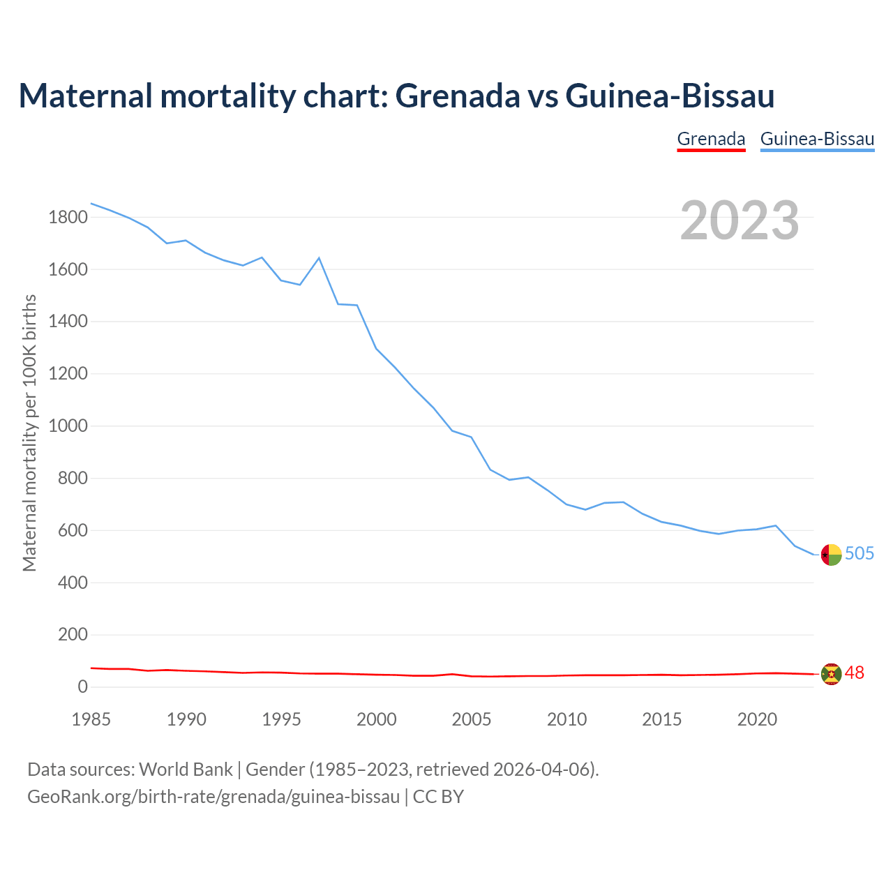 The maternal mortality rate, which is the probability of dying during childbirth or within 42 days of pregnancy termination, is 48 deaths per 100,000 live births in Grenada, compared to 505 deaths in Guinea-Bissau.