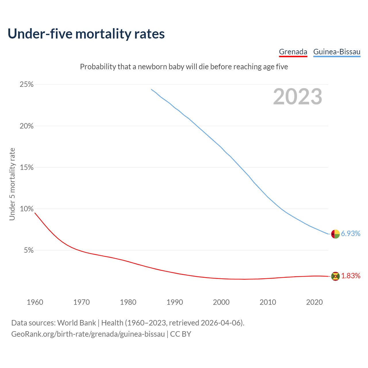 The chance that a newborn baby will die before reaching age five is 1.83% in Grenada and 6.93% in Guinea-Bissau. Above is a chart with historical data on under-five mortality rates.