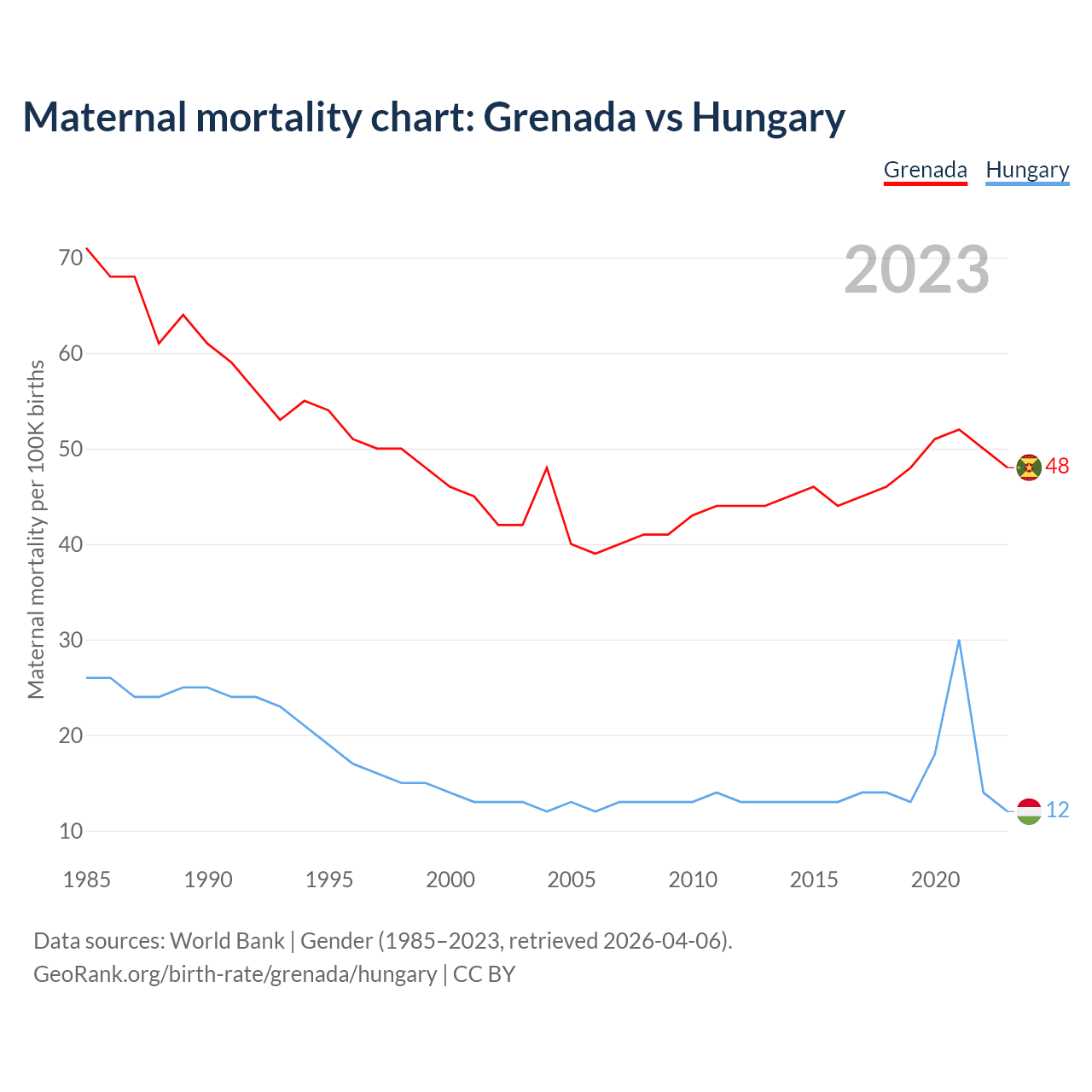 The maternal mortality rate, which is the probability of dying during childbirth or within 42 days of pregnancy termination, is 48 deaths per 100,000 live births in Grenada, compared to 12 deaths in Hungary.