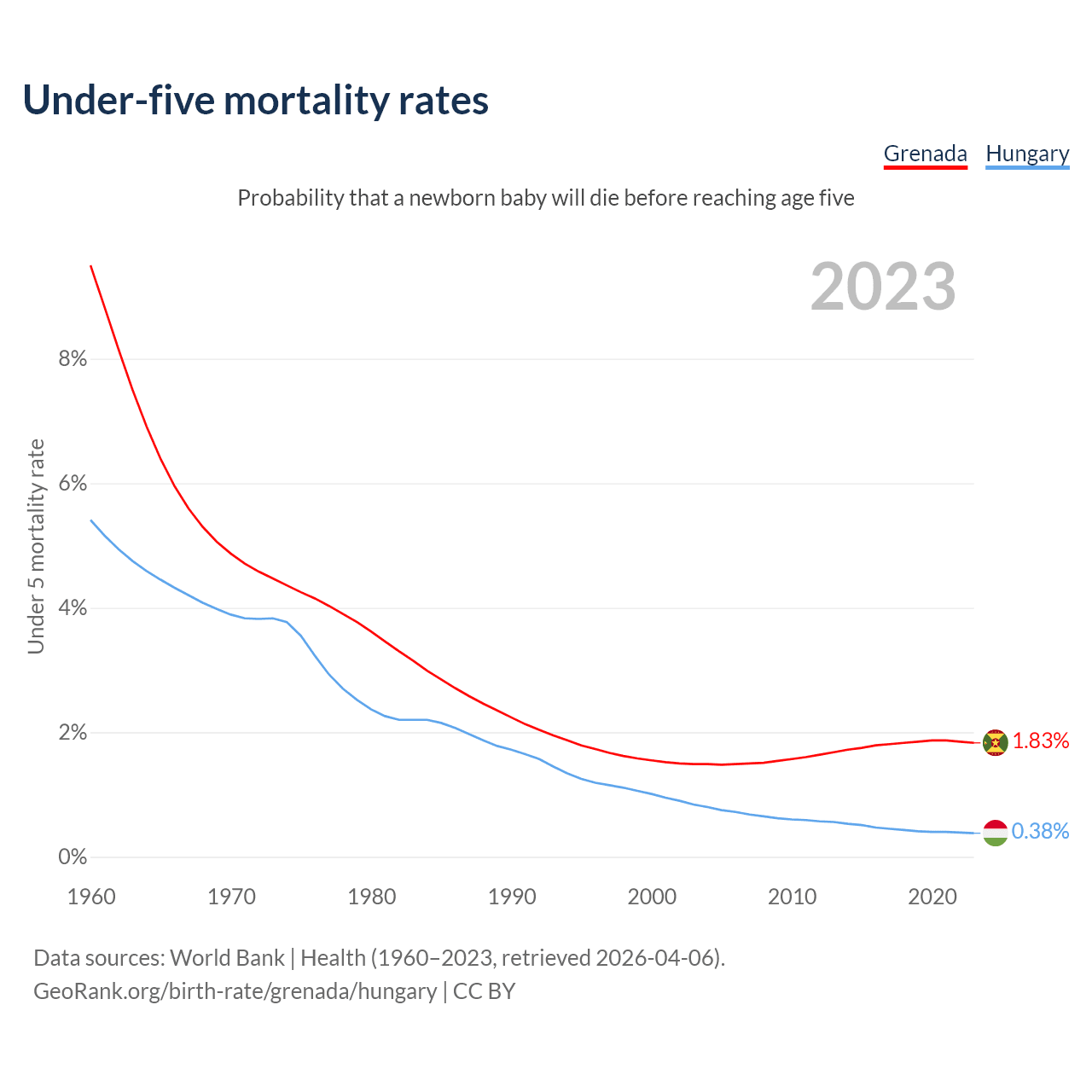 The chance that a newborn baby will die before reaching age five is 1.83% in Grenada and 0.38% in Hungary. Above is a chart with historical data on under-five mortality rates.