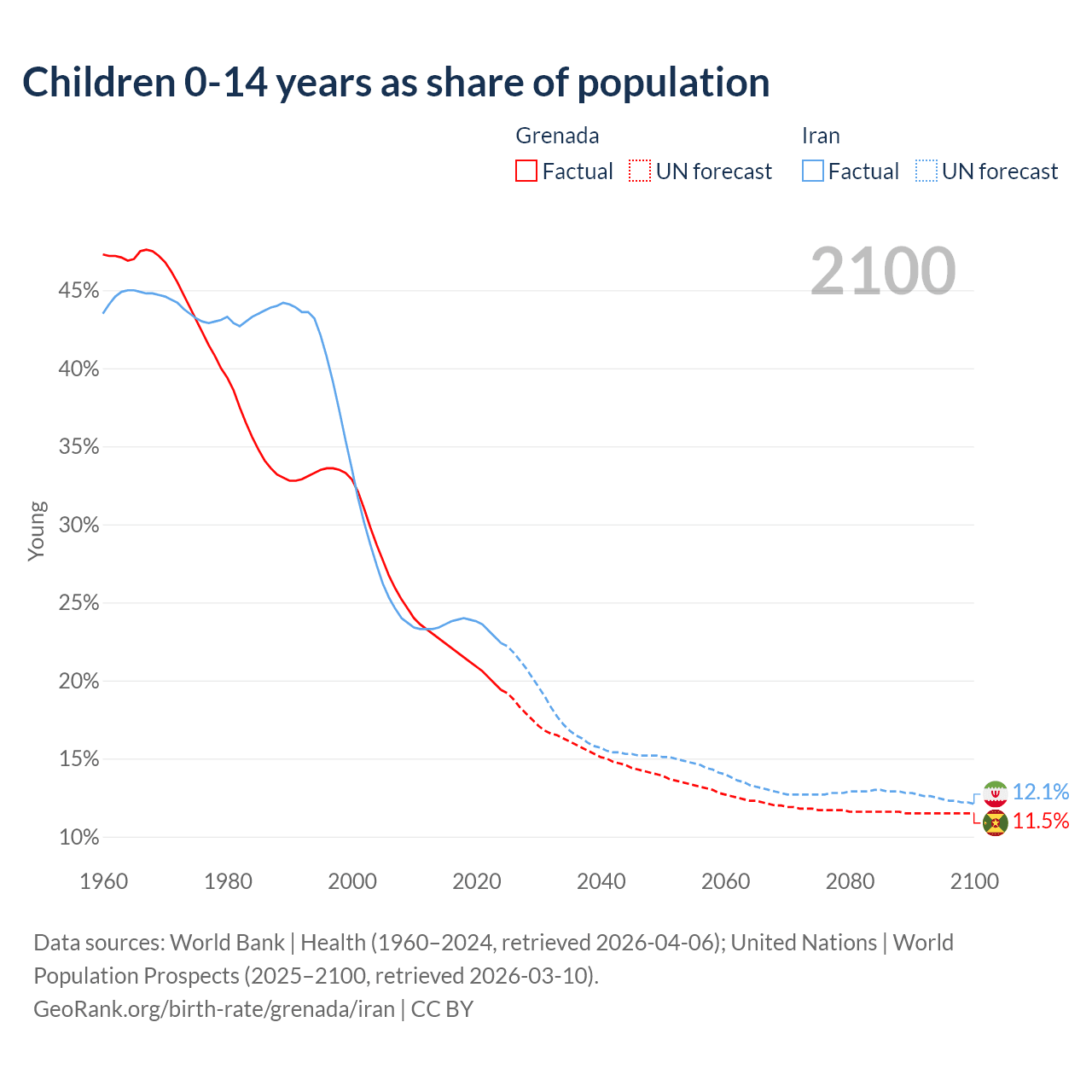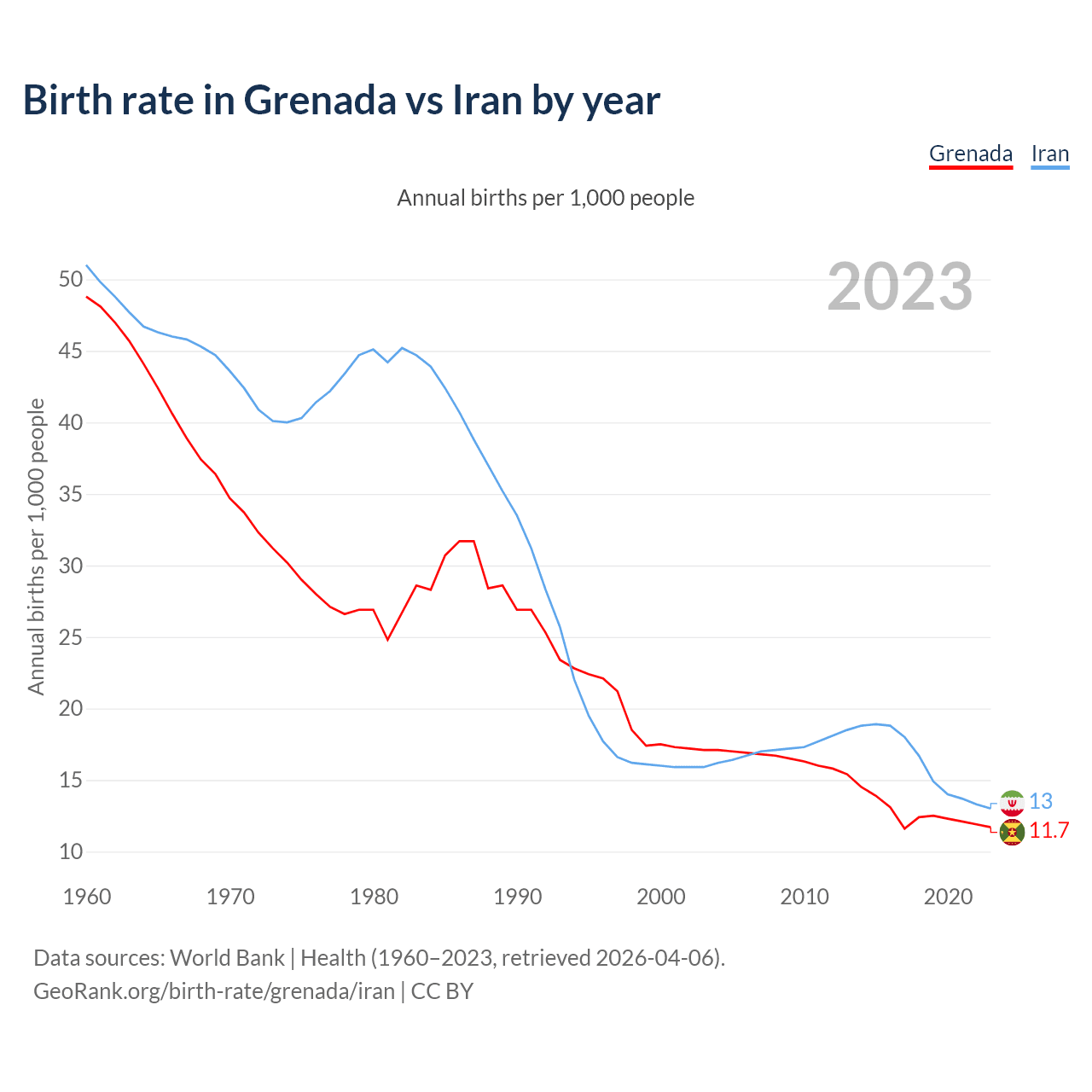 Grenada has an annual birth rate of 11.7 births per 1,000 people, compared to 13 for Iran. The average number of children a woman is expected to have during her lifetime — the fertility rate, is 1.49 in Grenada and 1.7 in Iran — 14% difference.