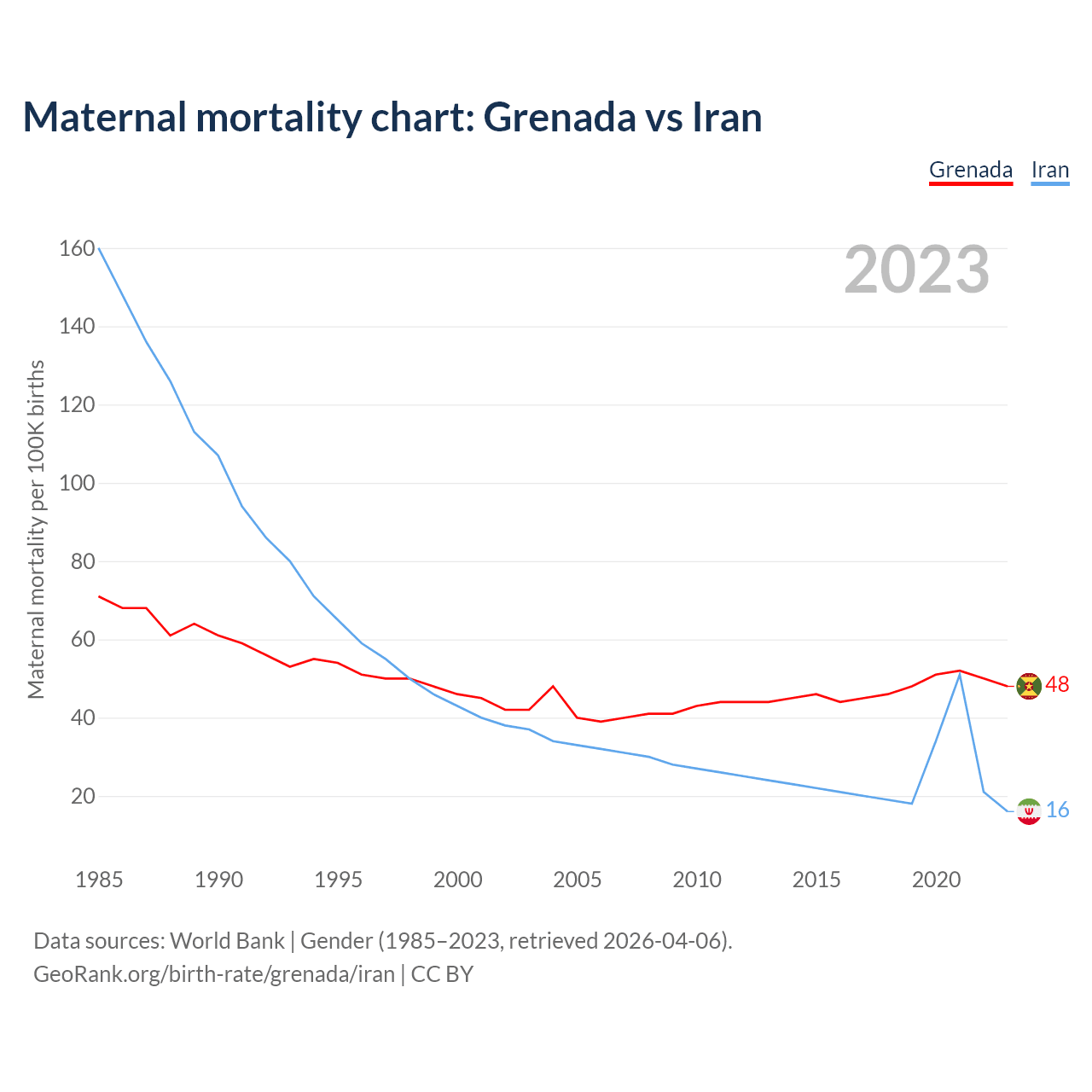 The maternal mortality rate, which is the probability of dying during childbirth or within 42 days of pregnancy termination, is 48 deaths per 100,000 live births in Grenada, compared to 16 deaths in Iran.