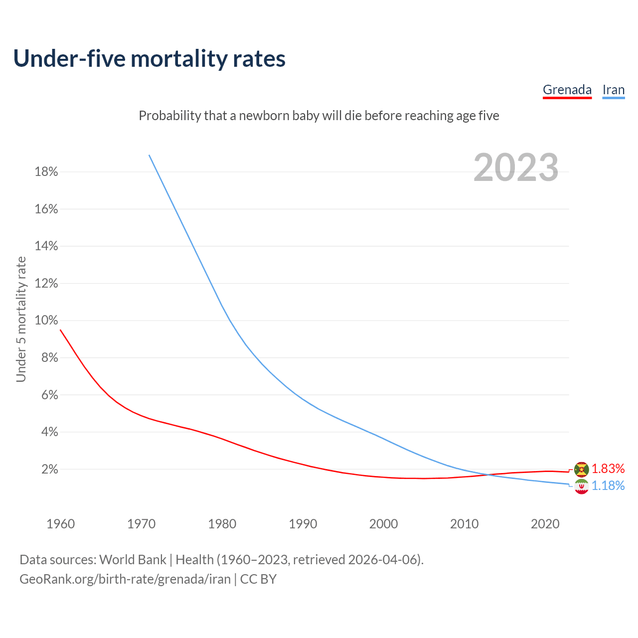 The chance that a newborn baby will die before reaching age five is 1.83% in Grenada and 1.18% in Iran. Above is a chart with historical data on under-five mortality rates.