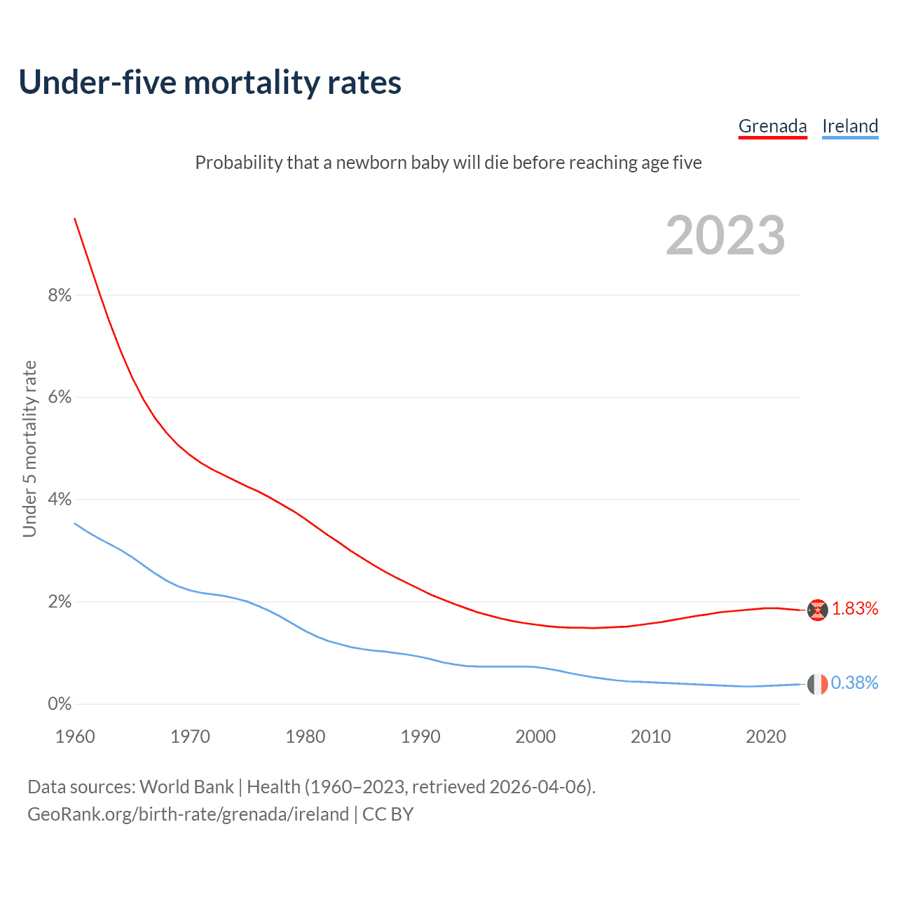 The chance that a newborn baby will die before reaching age five is 1.83% in Grenada and 0.38% in Ireland. Above is a chart with historical data on under-five mortality rates.
