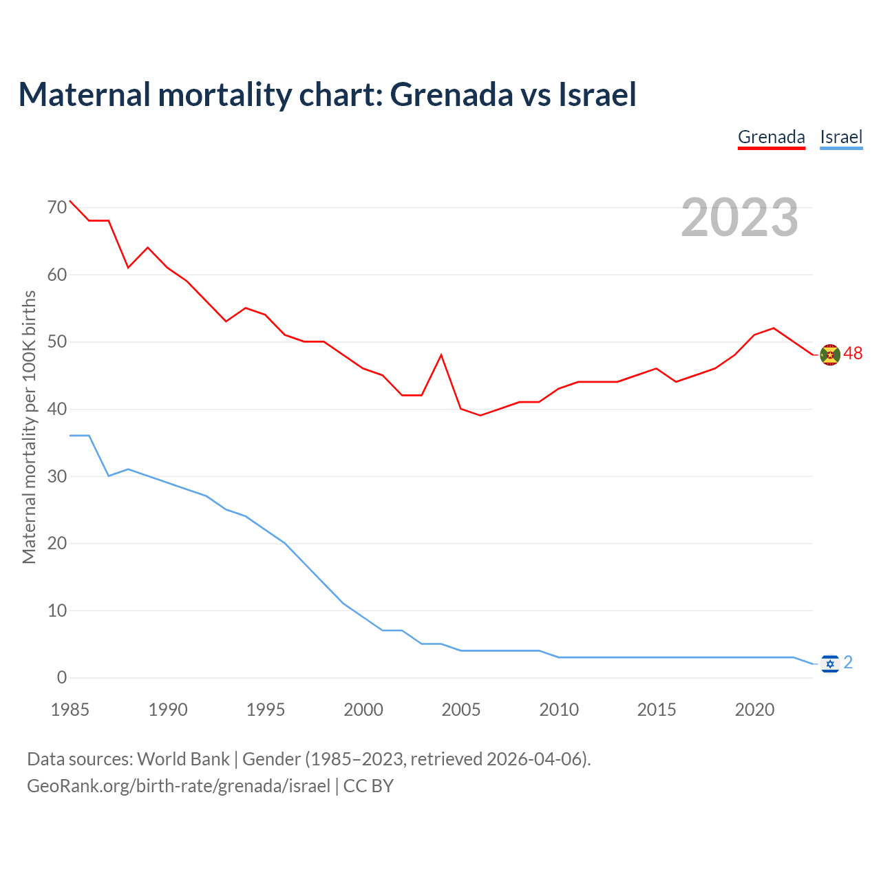 The maternal mortality rate, which is the probability of dying during childbirth or within 42 days of pregnancy termination, is 48 deaths per 100,000 live births in Grenada, compared to 2 deaths in Israel.