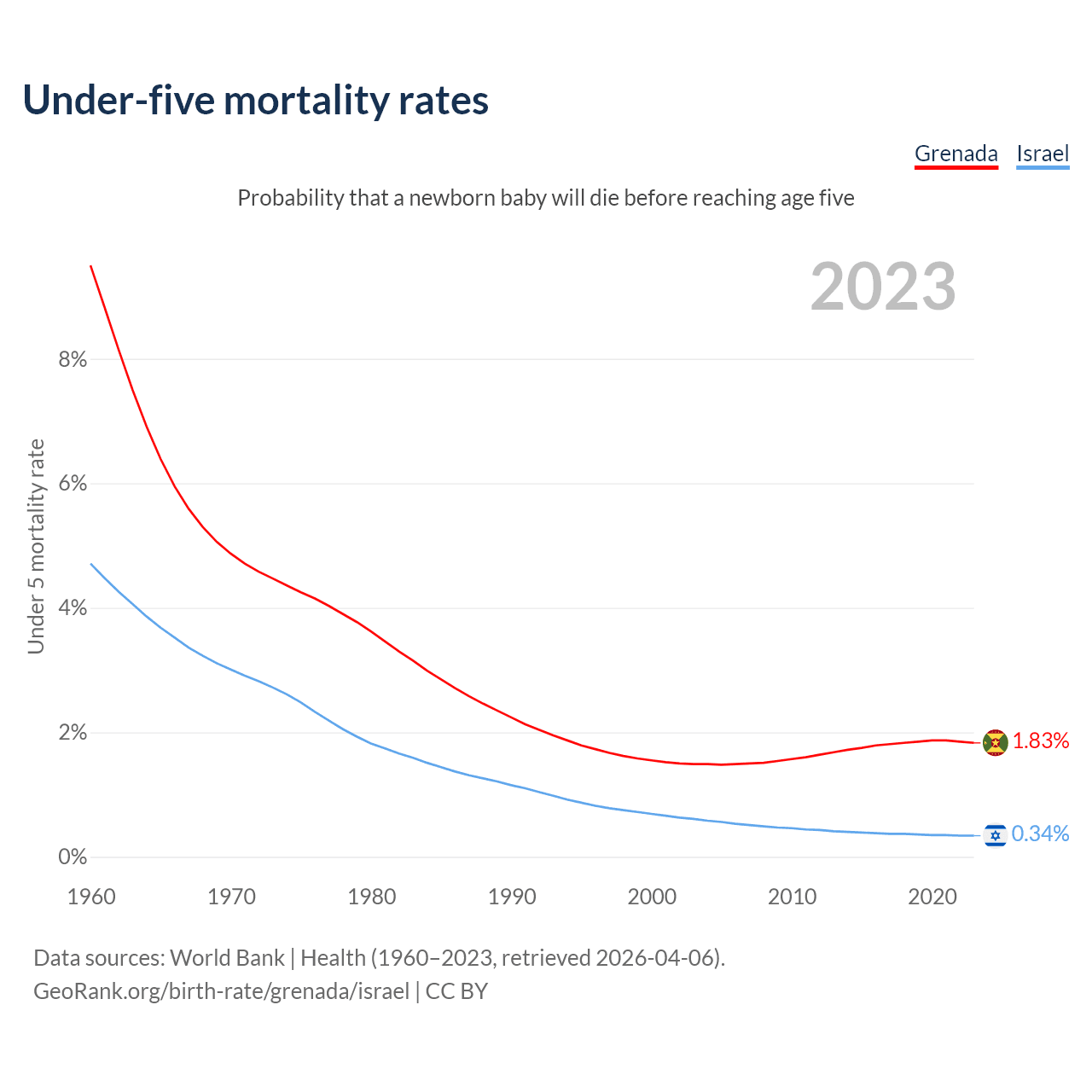 The chance that a newborn baby will die before reaching age five is 1.83% in Grenada and 0.34% in Israel. Above is a chart with historical data on under-five mortality rates.