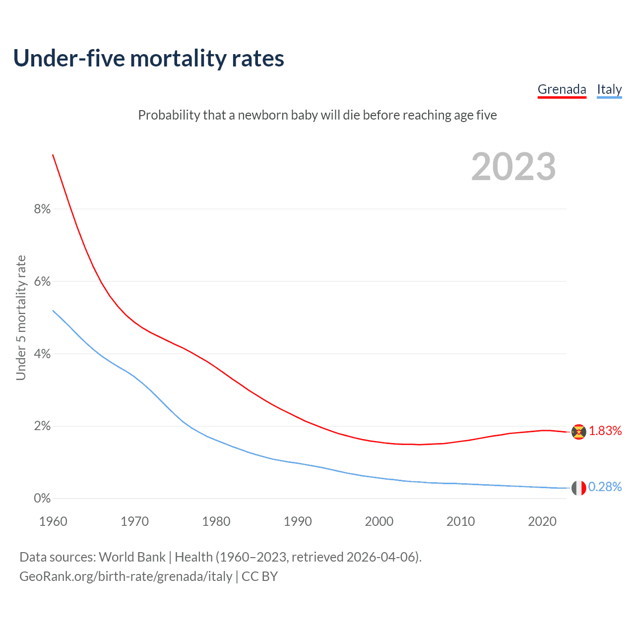 The chance that a newborn baby will die before reaching age five is 1.83% in Grenada and 0.28% in Italy. Above is a chart with historical data on under-five mortality rates.