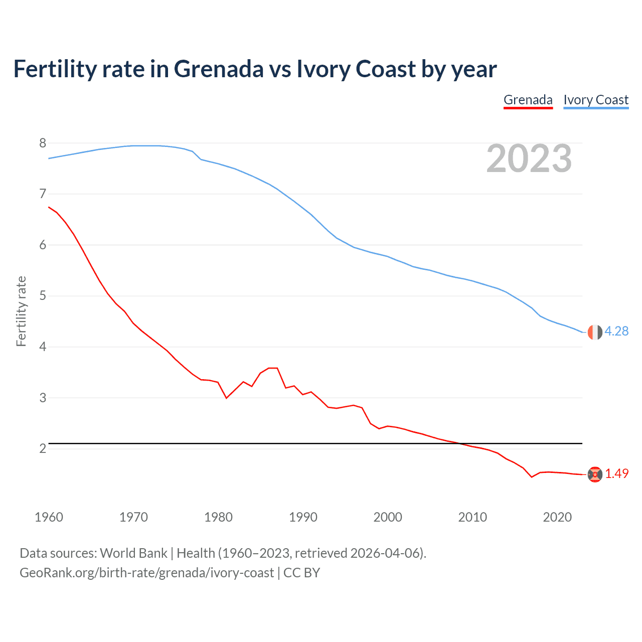 1960 vs 2023, the fertility rate has decreased by 77.9% in Grenada and by 44.3% in Ivory Coast — in 1960, it was 6.74 and 7.69, respectively.